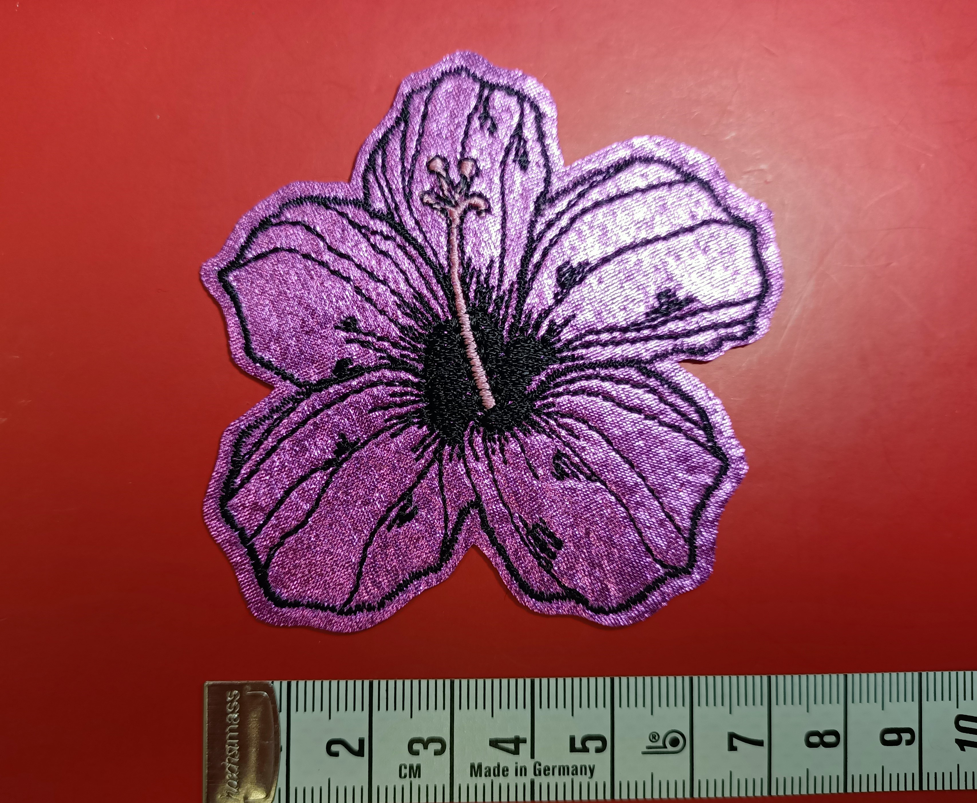 Aplikacja w kształcie kwiatka lilia w kolorze fioletowym. Wymiar to 7,5 cm. Nadaje się do ozdoby różnorodnych produktów takich jak odzież, plecaki, torby itd. Może służyć również jako łatka do zniszczonej odzieży.