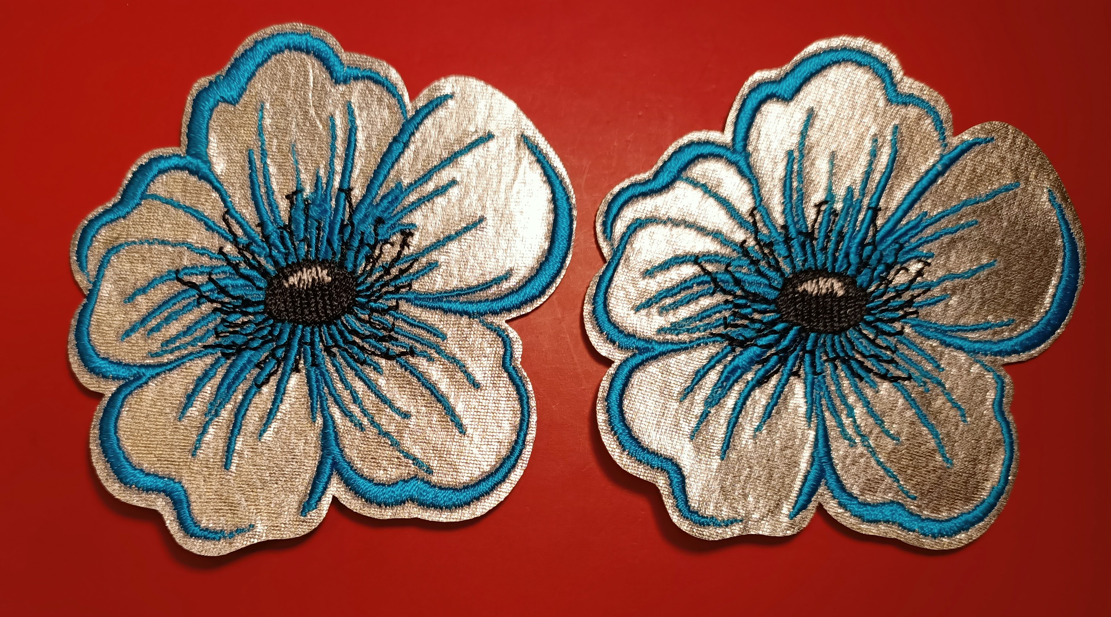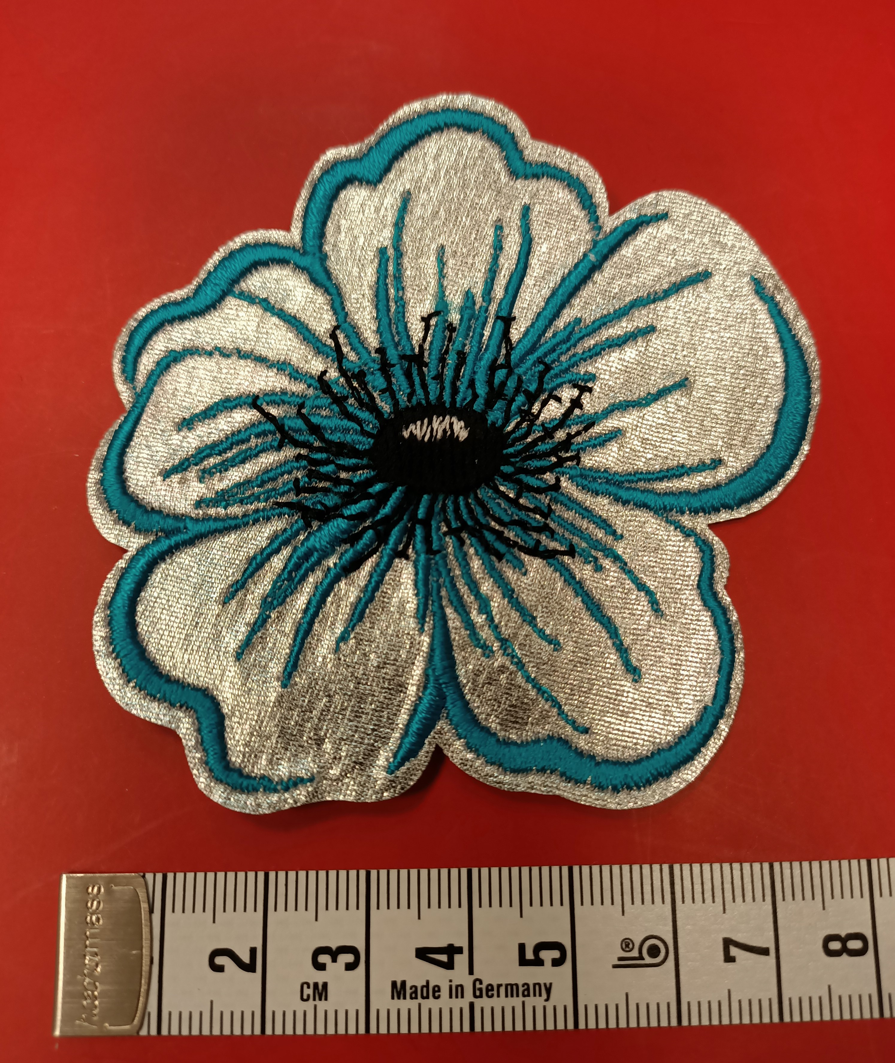 Aplikacja w kształcie kwiatka w kolorze niebieskim. Wymiar to 7,5 cm. Nadaje się do ozdoby różnorodnych produktów takich jak odzież, plecaki, torby itd. Może służyć również jako łatka do zniszczonej odzieży.