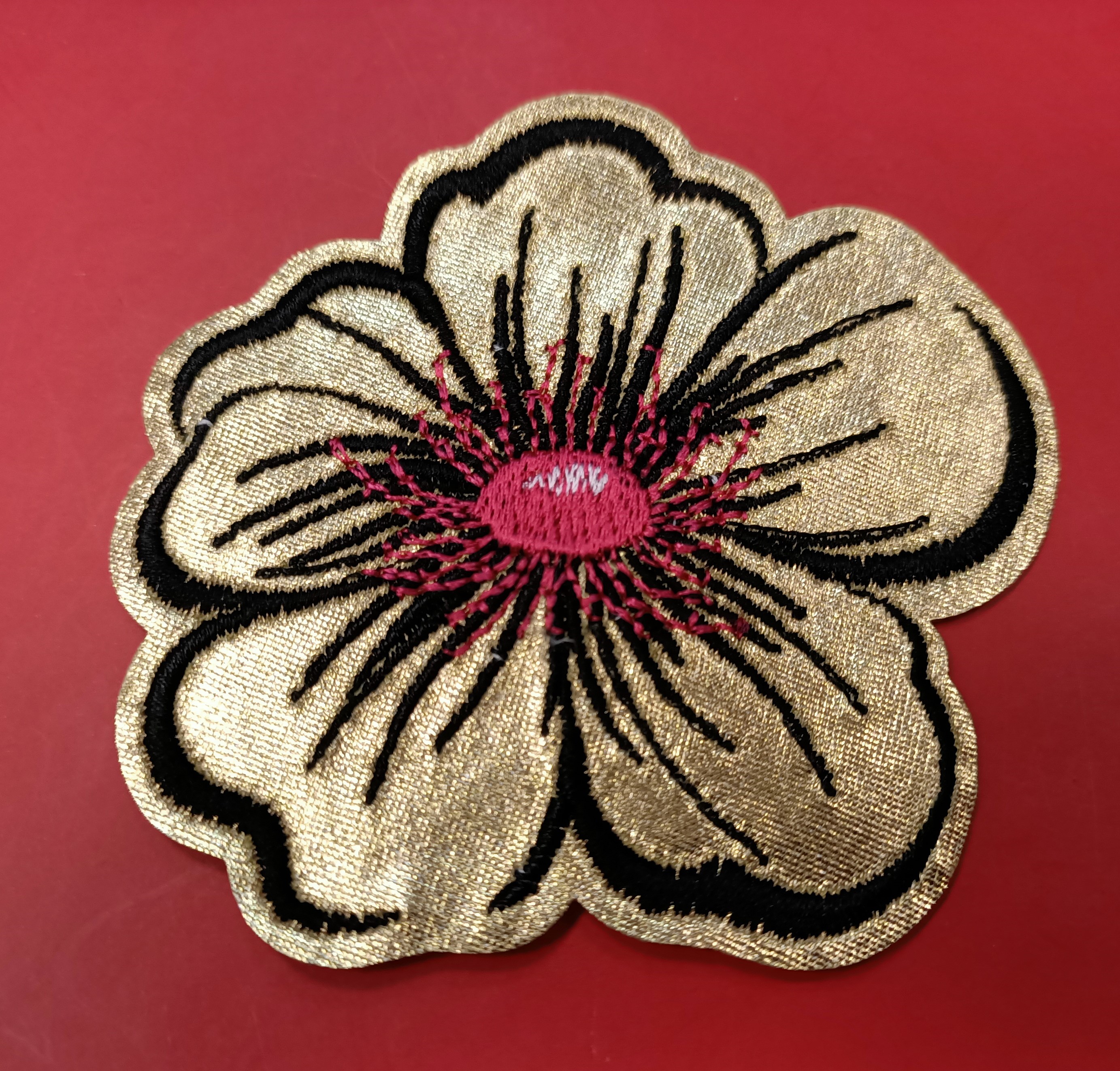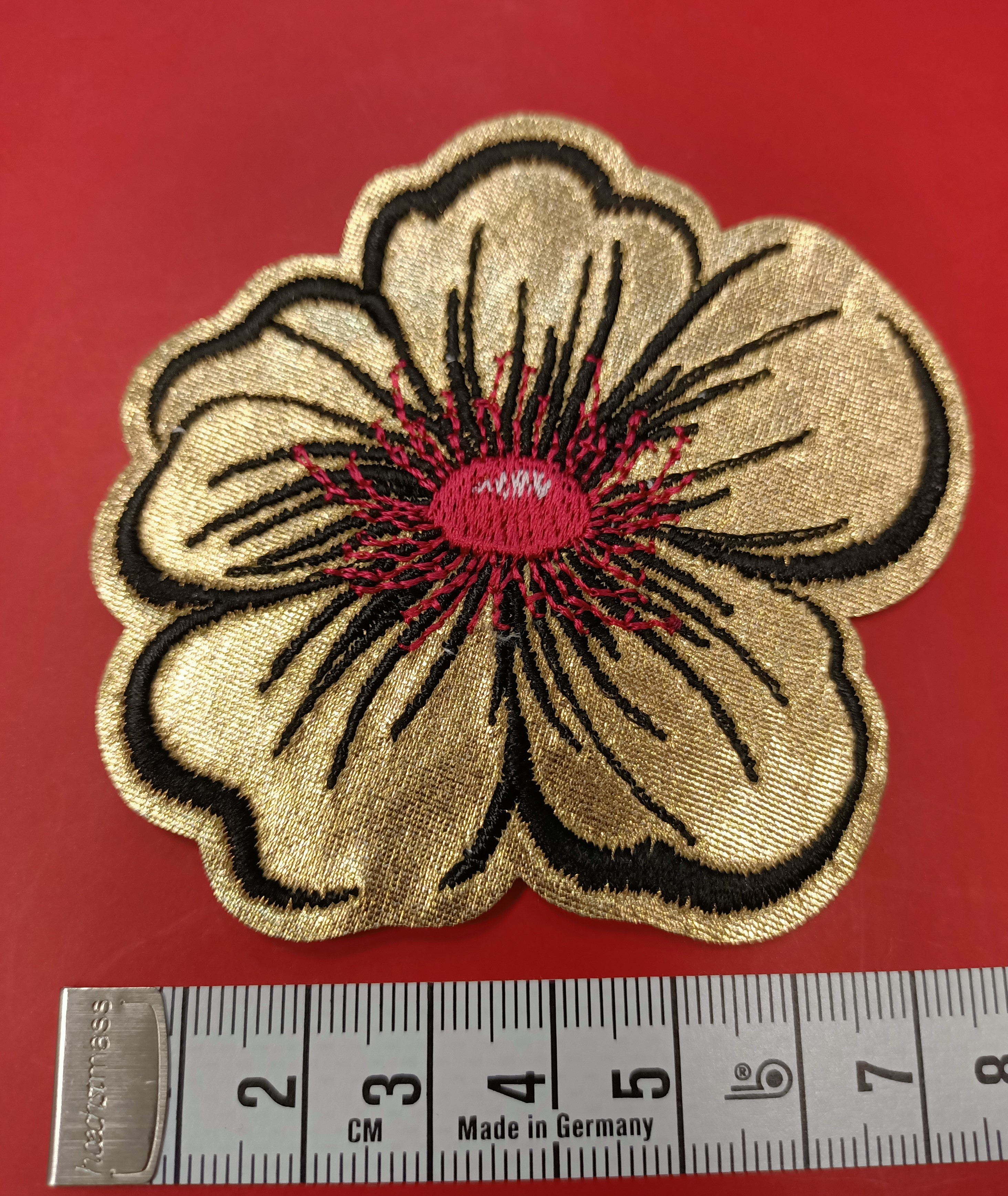 Aplikacja w kształcie kwiatka w kolorze złotym. Wymiar to 7,5 cm. Nadaje się do ozdoby różnorodnych produktów takich jak odzież, plecaki, torby itd. Może służyć również jako łatka do zniszczonej odzieży.