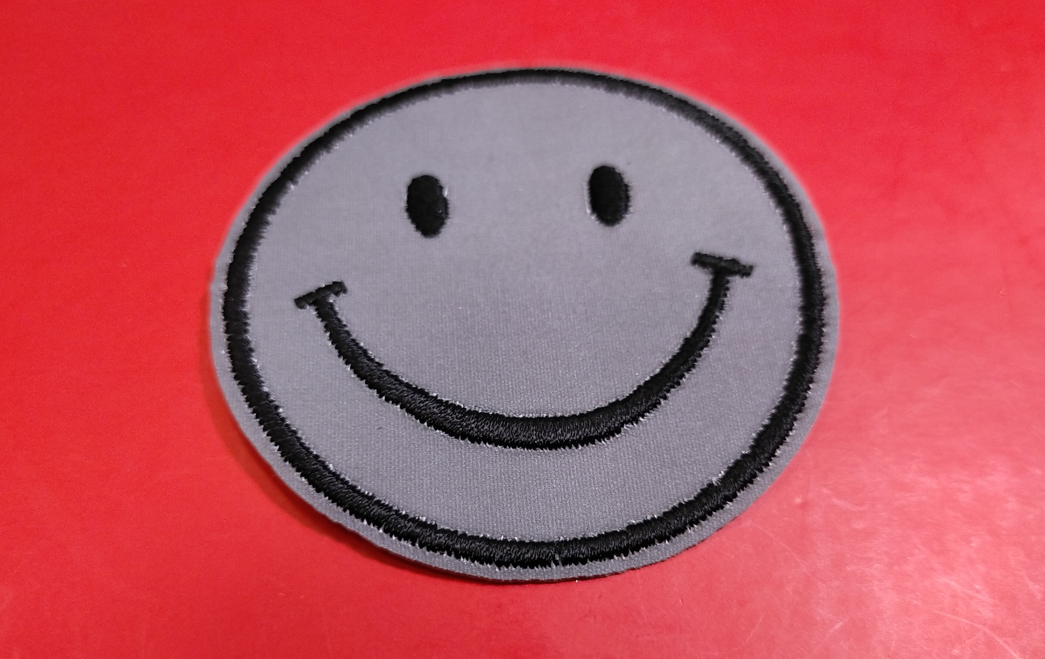 Okrągła aplikacja w kolorze szarym, przedstawiająca buźkę z klejem do wklejania na gorąco. Średnica to 6 cm. Nadaje się do ozdoby różnorodnych produktów takich jak odzież, plecaki, torby itd. Może służyć również jako łatka do zniszczonej odzieży. Produkt wykonany w Polsce. Można prać do 40 C.