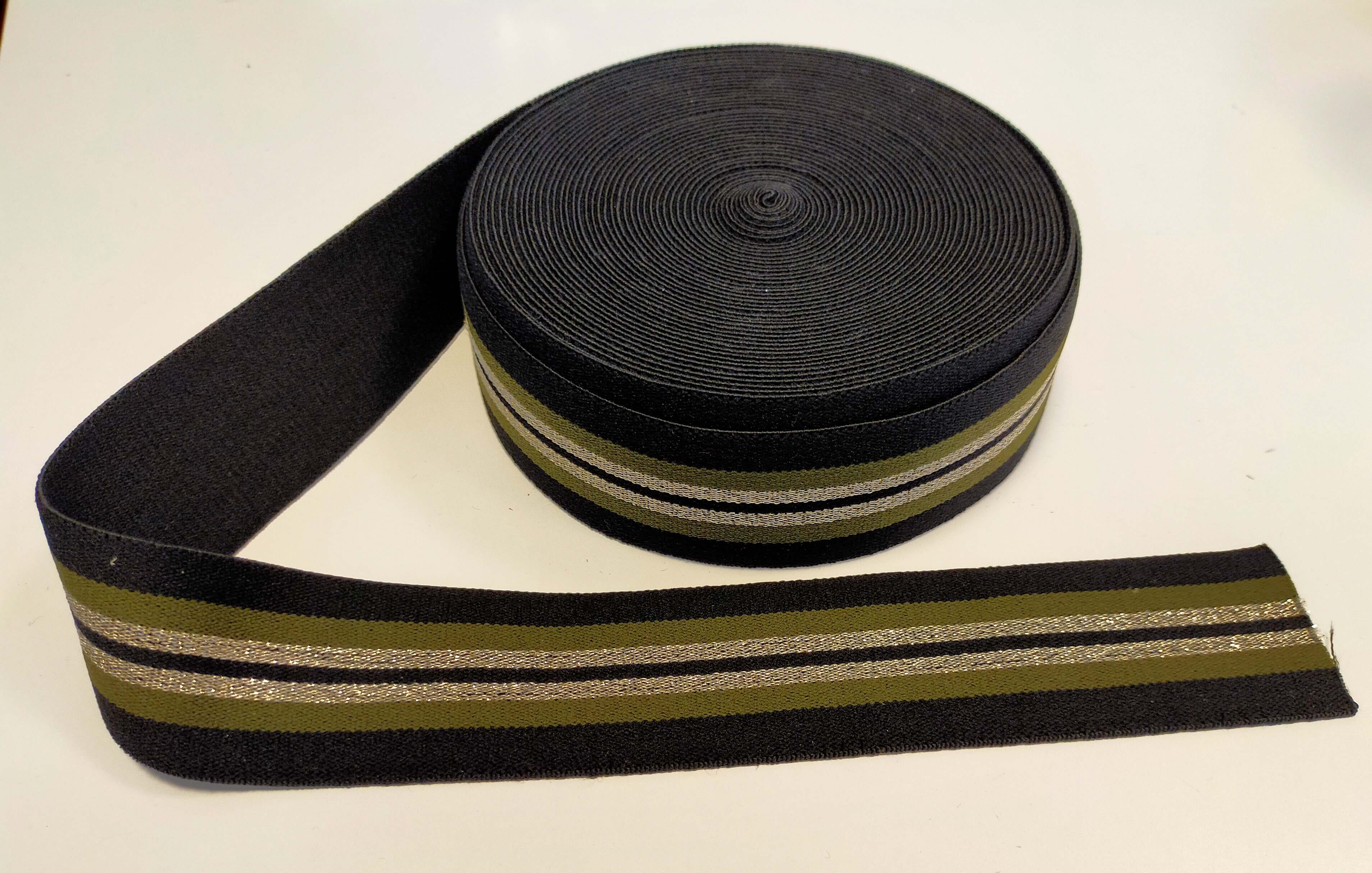 Guma ozdobna zielono złota, szerokość 4 cm.  Przykładowe zastosowanie: do spodni, bluz, kurtek, spódnic, pasów, ściągaczy
