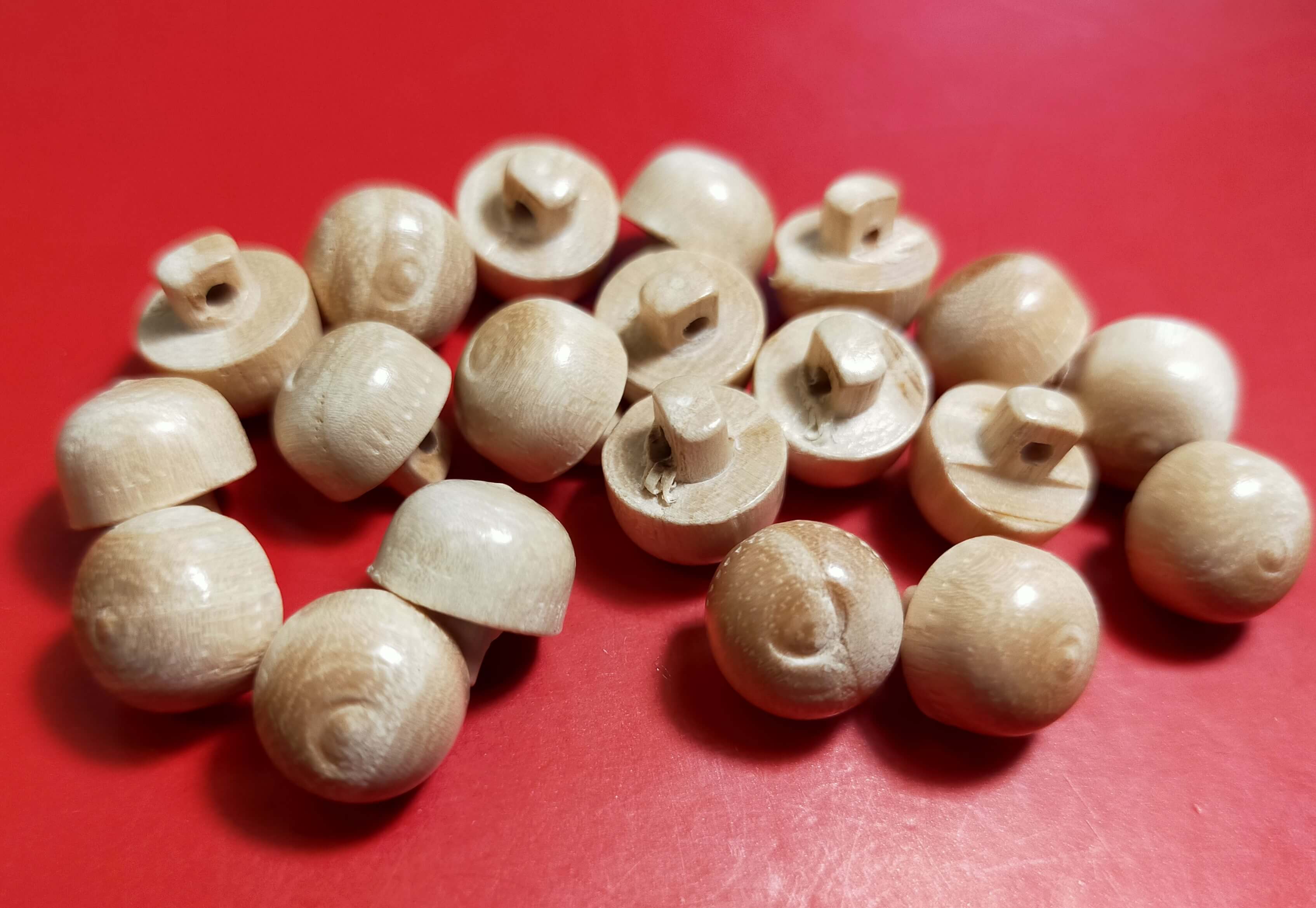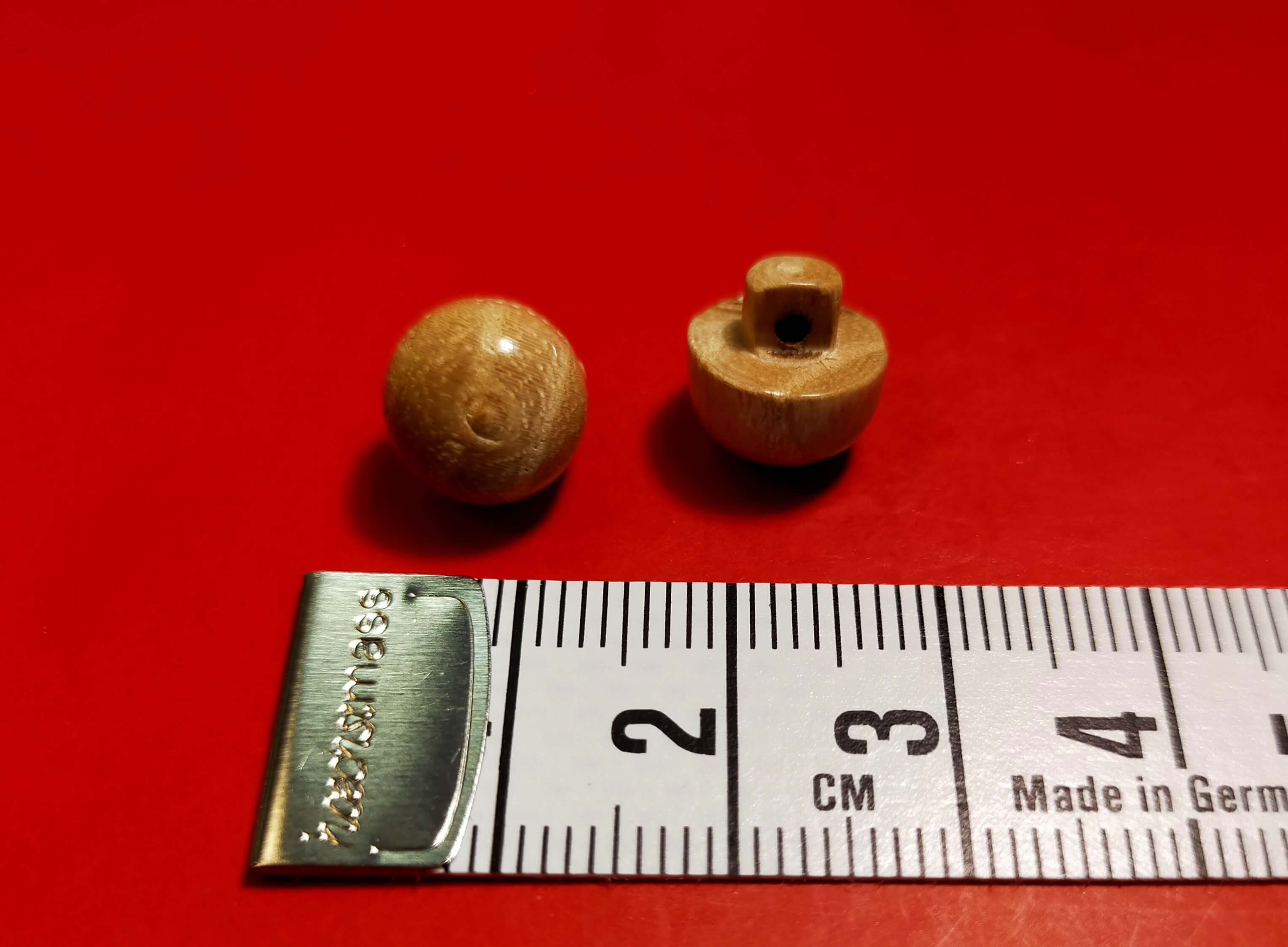Guzik drewniany perełka duży o średnicy 8 mm. Przykładowe zastosowanie: zapięcie do bluzki, swetra, rozporków
