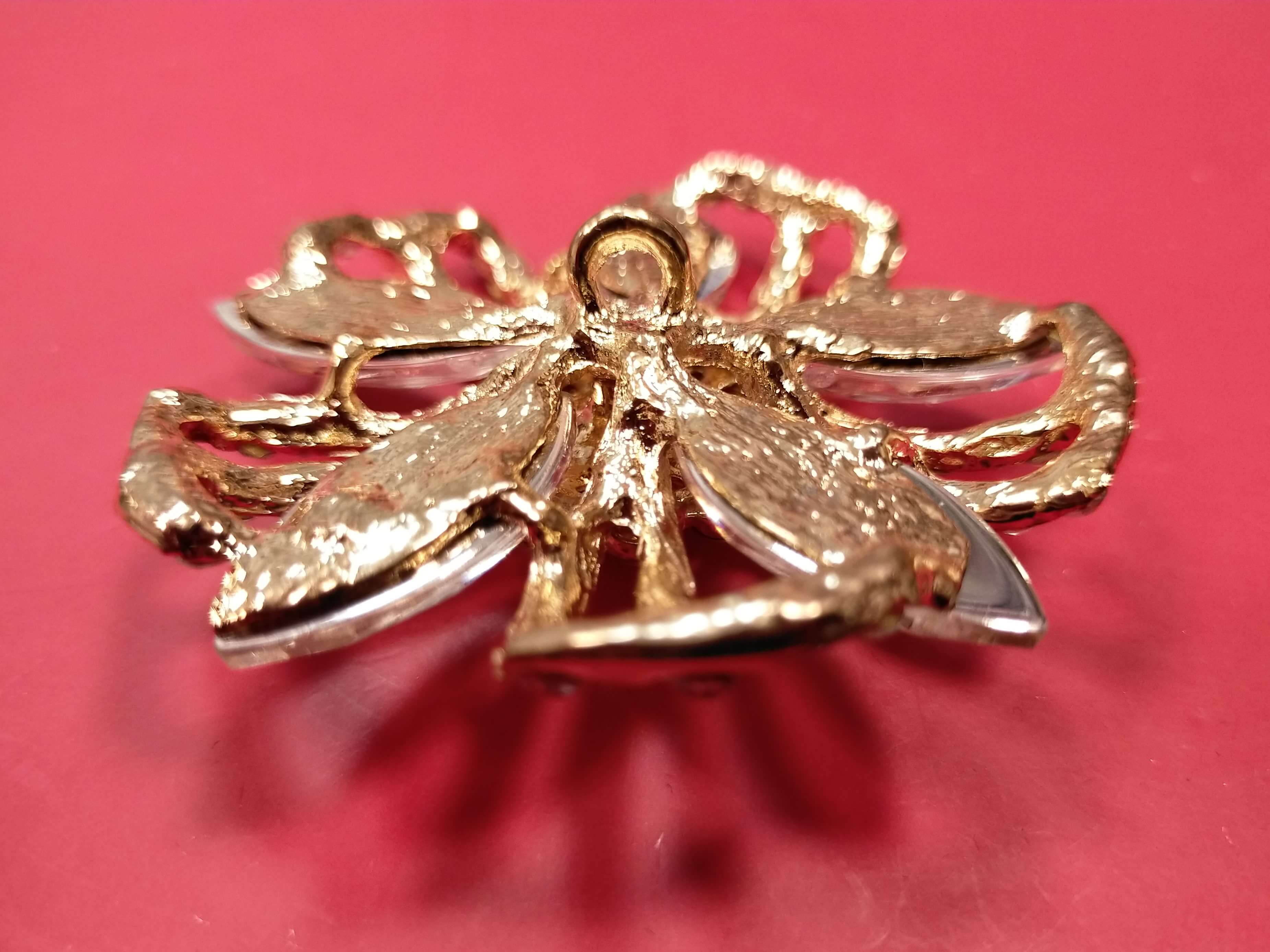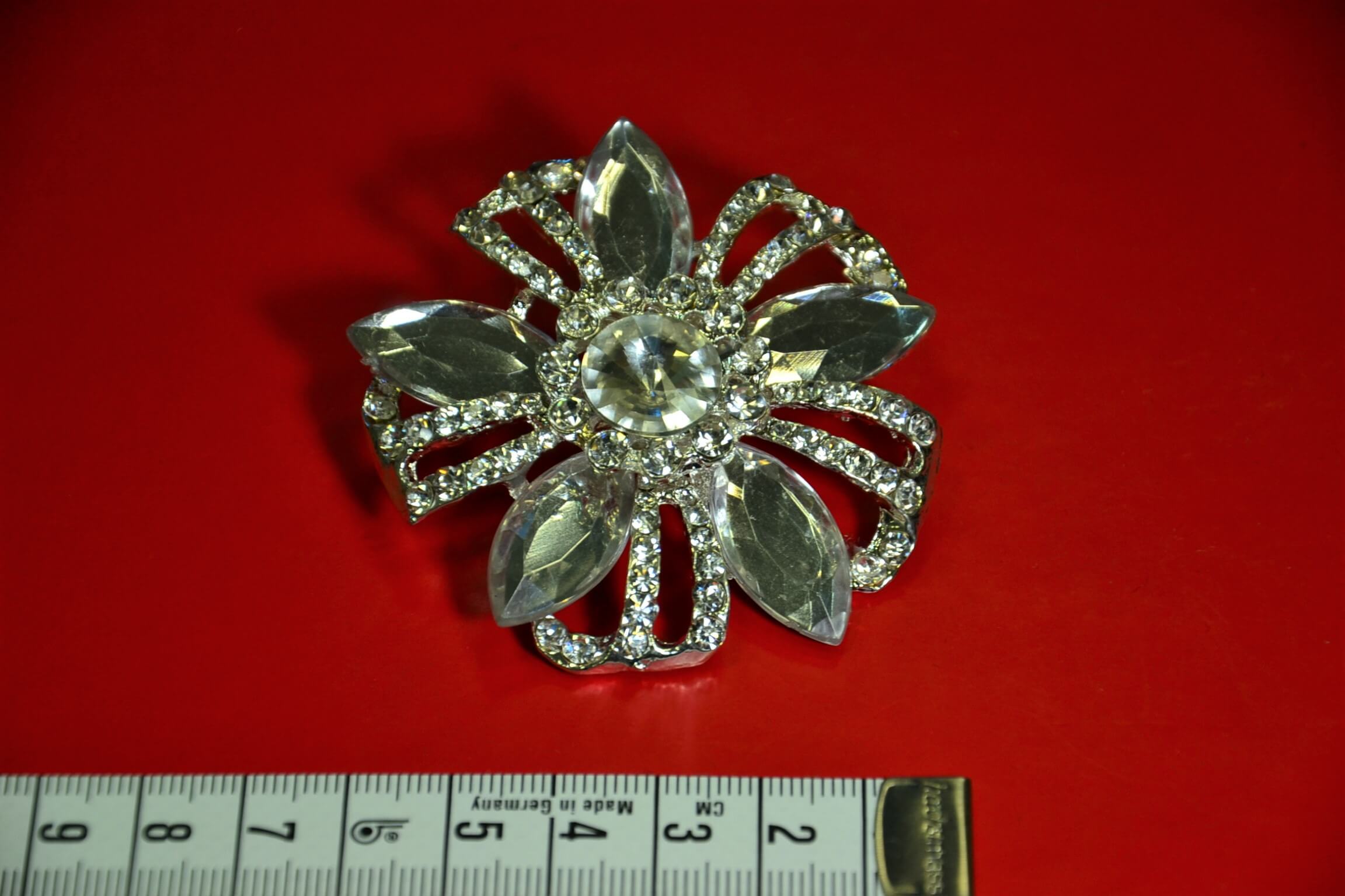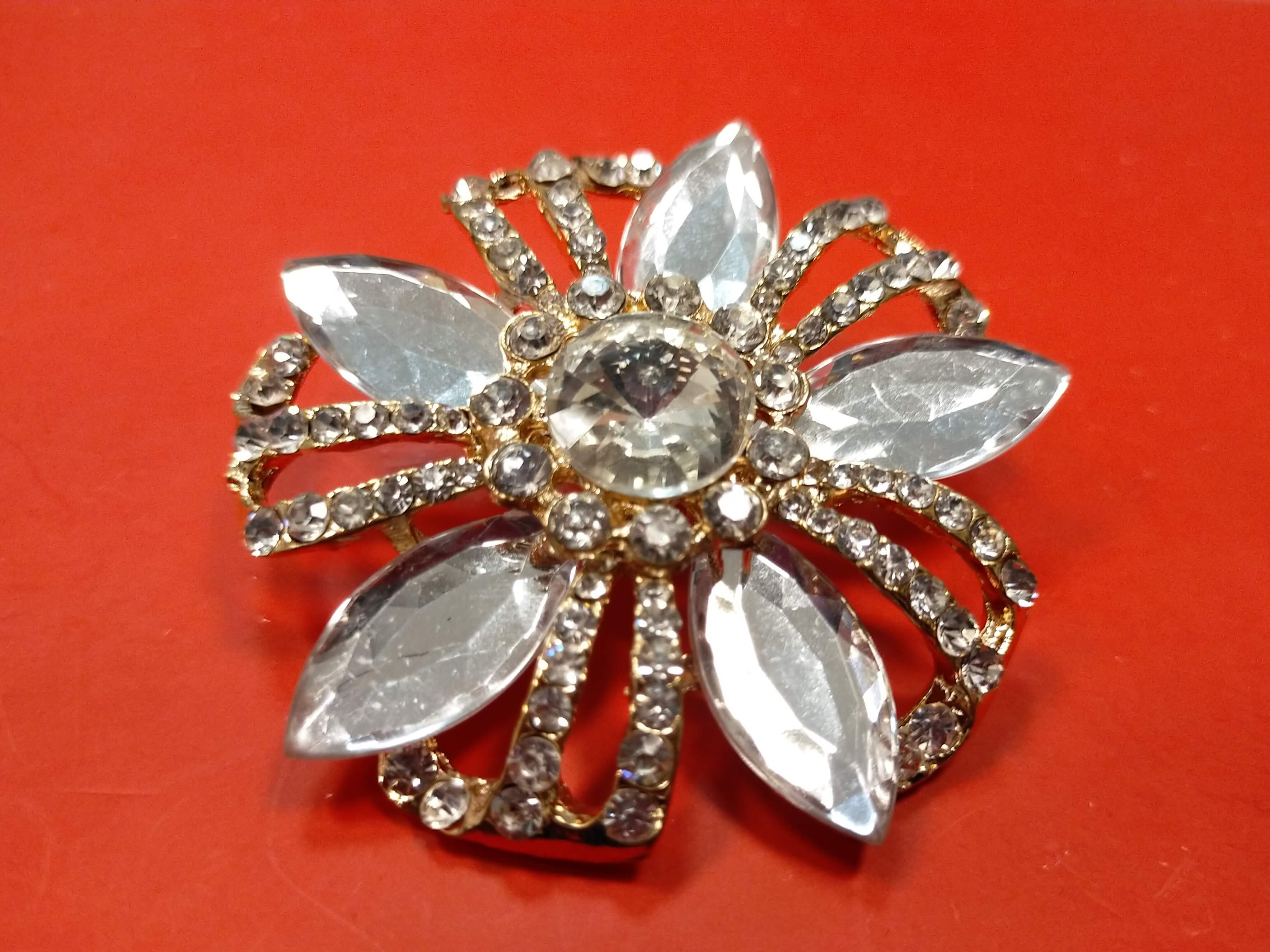 Guzik w kształcie kwiatu złoty wykładany kryształkami akrylowymi o średnicy 6 cm, na uszku.  Będzie świetnym dodatkiem do Twojej sukienki, bluzki lub marynarki.