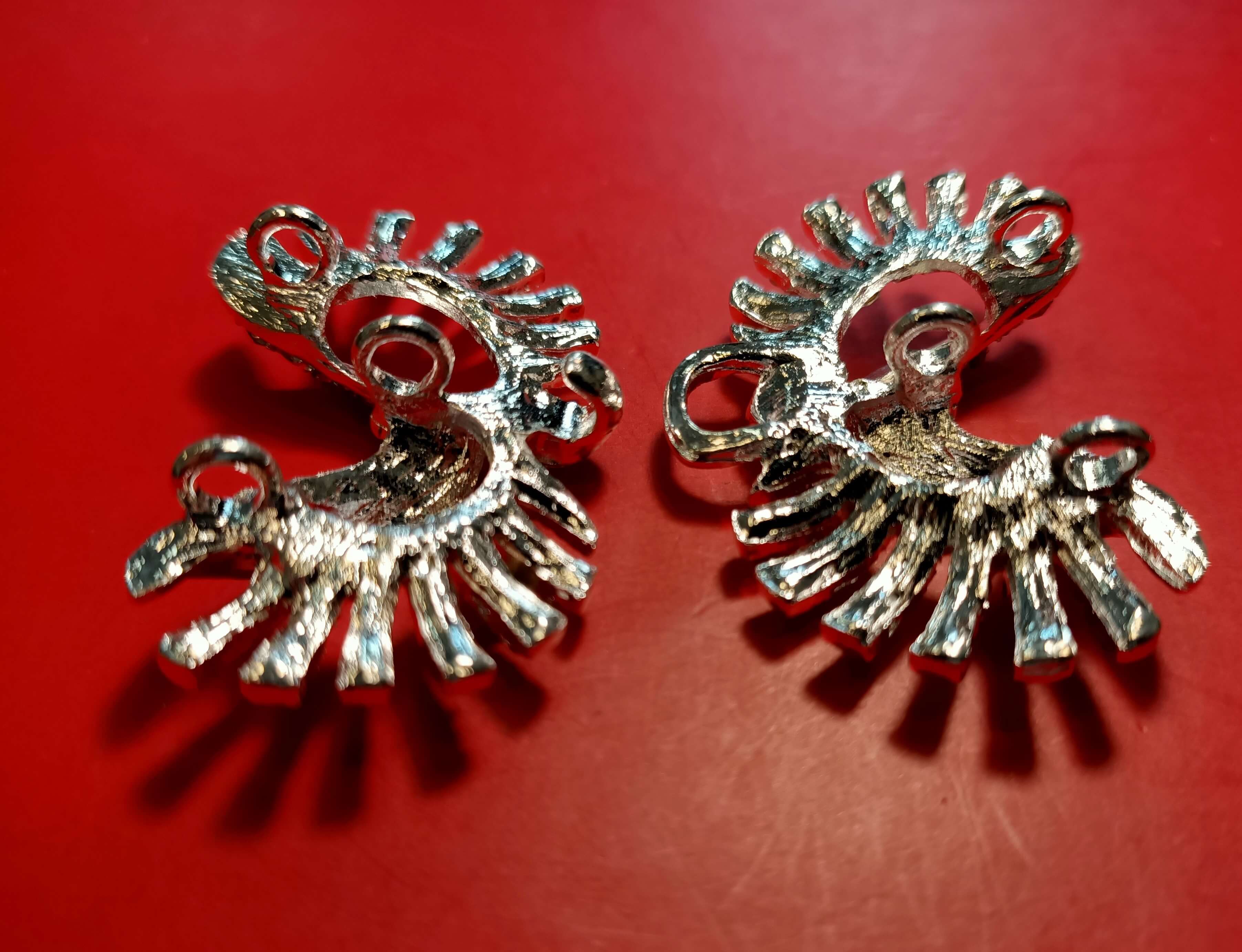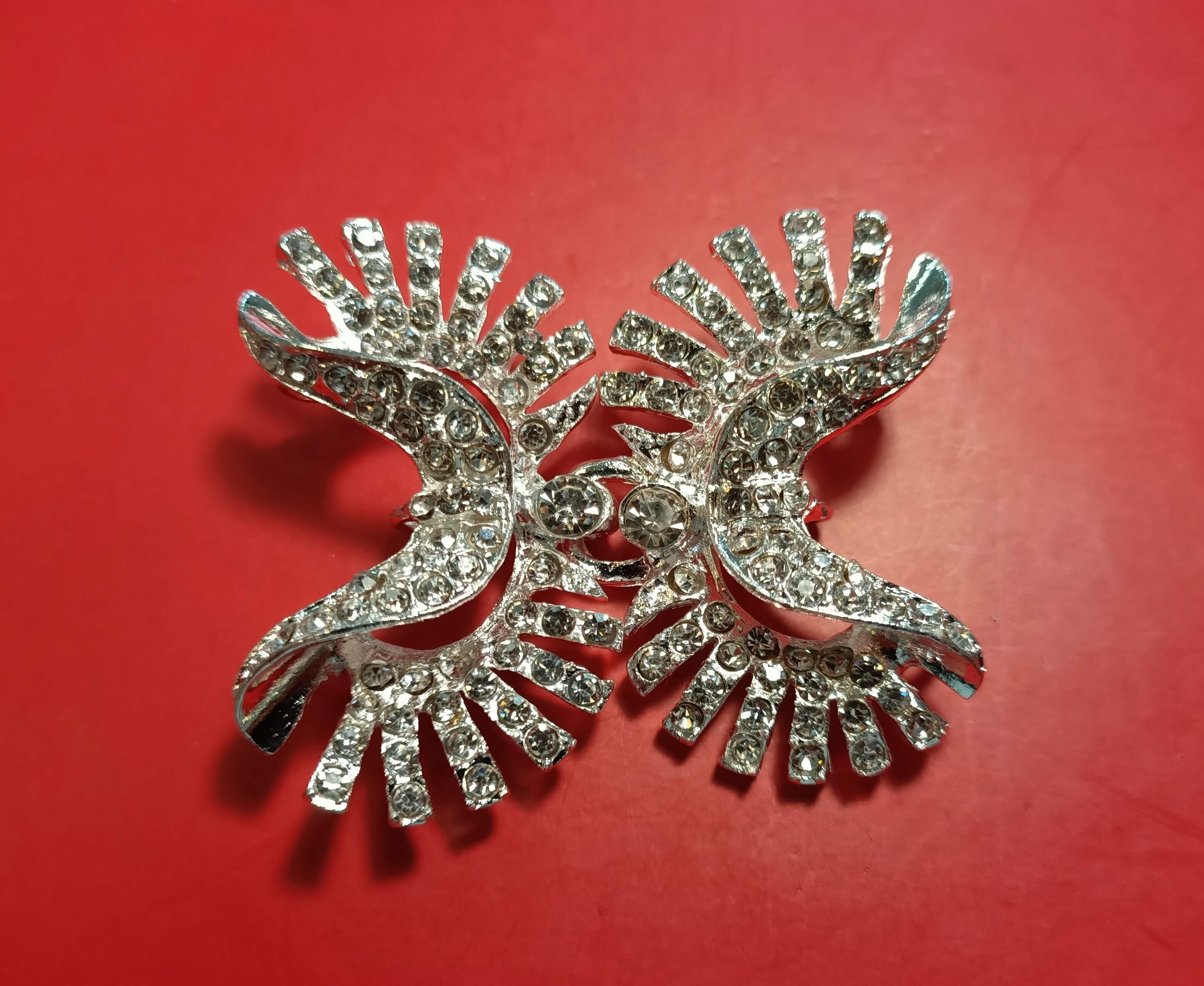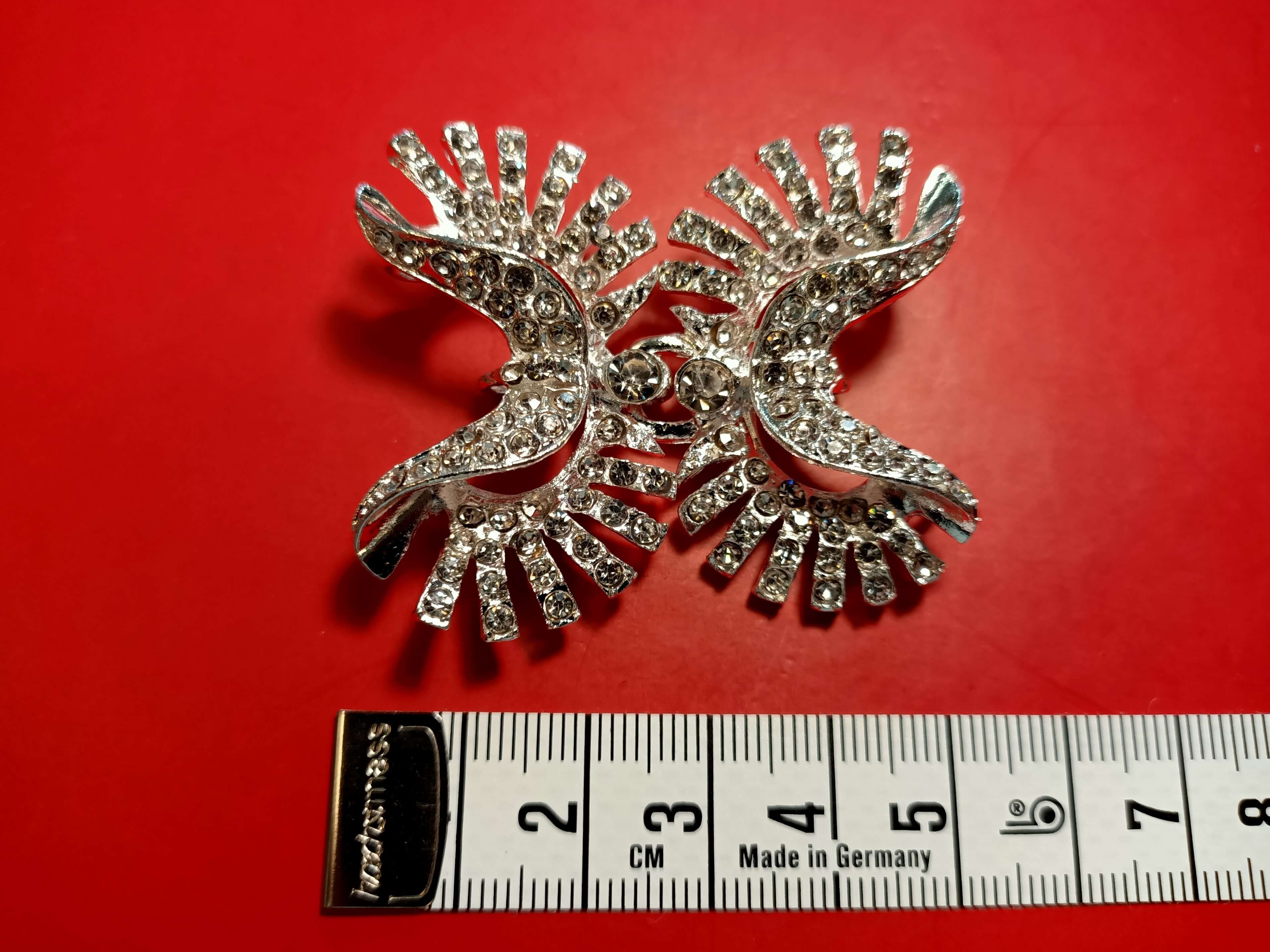 Haftka ozdobna w kolorze srebrnym wykładana kryształkami. Wymiar haftki to 5 cm x 3 cm.