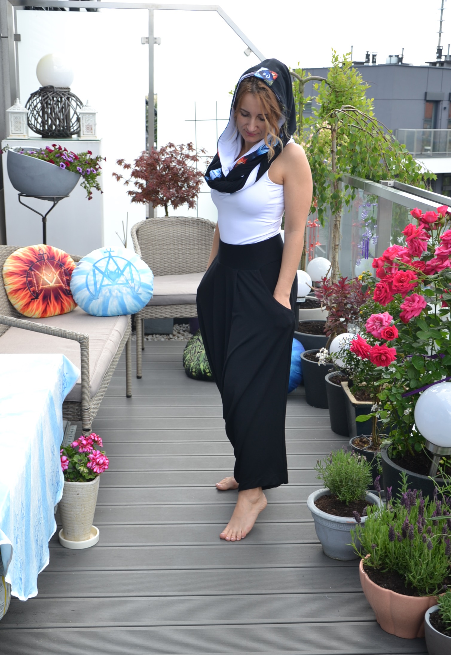 Kamizelko omotka CHI jest wykonana z dzianiny bambusowej i wiskozy tkanej na terenie Polski przez Polskiego producenta posiadającego certyfikat ECO. Jest dwustronna i dwukolorowa ( czarno-biała ). Po zapięciu zamka na plecach omotka staje się kamizelką, a po rozpięciu tego zamka kamizelka staję się omotką. Produkt posiada poręczną kieszonkę na zamek. Pranie w 30 stopniach, delikatne środki piorące. Bardzo wygodna w noszeniu, delikatna do ciała. Bardzo dobrze prezentuje się w zestawie z bluzką i spodniami.