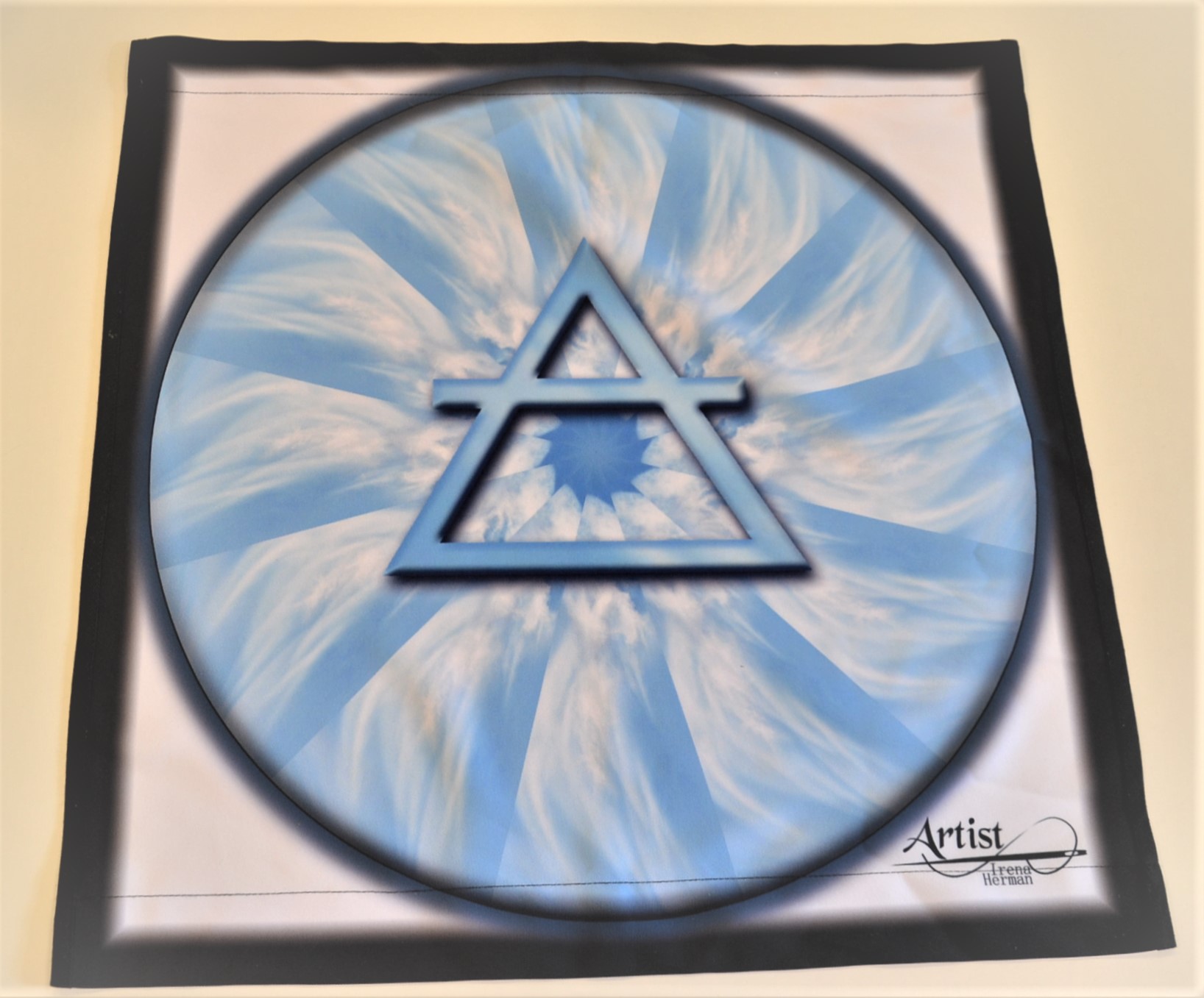Makata ze wzorem żywiołu powietrza w kwadracie wykonana z tkaniny typu bistrecz. Do makaty dołączone są listwy do wieszania.
