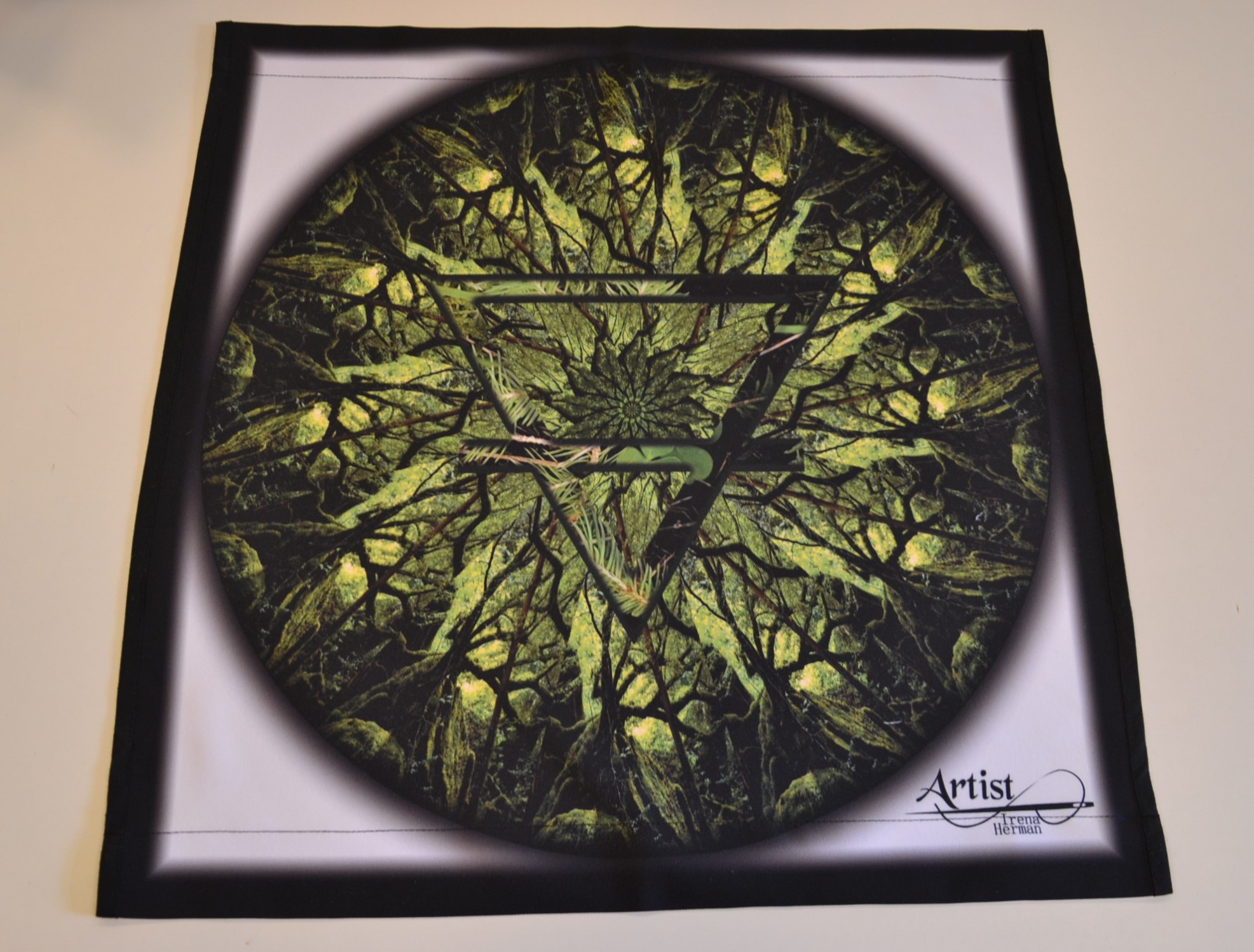 Makata ze wzorem żywiołu ziemi w kwadracie wykonana z tkaniny typu bistrecz. Do makaty dołączone są listwy do wieszania.