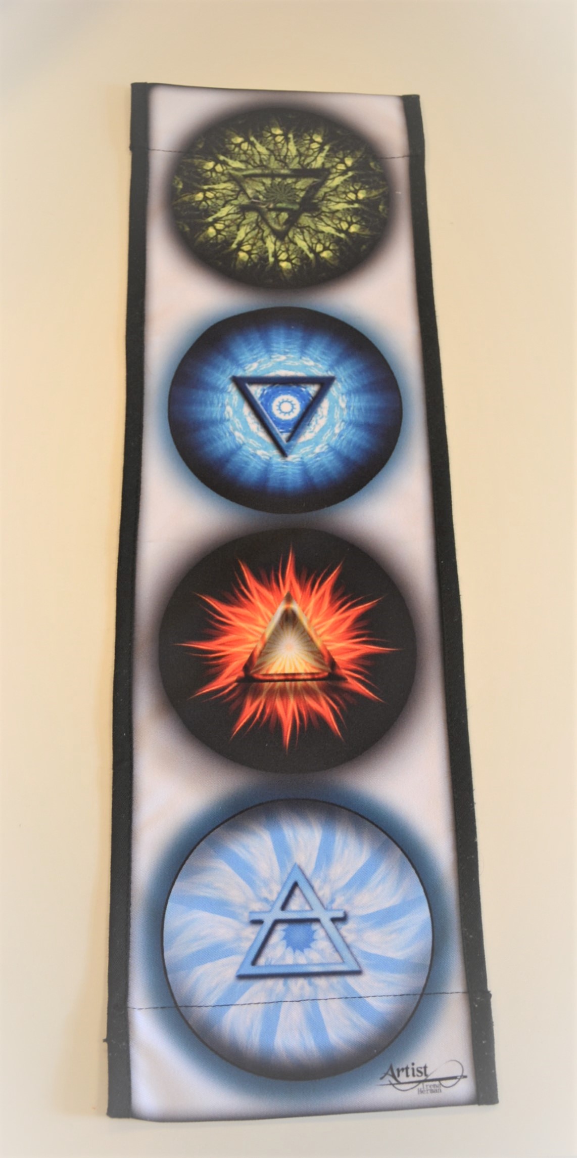 Mini makata ze wzorem czterech żywiołów wykonana z tkaniny typu bistrecz. Do makaty dołączone są listwy do wieszania.