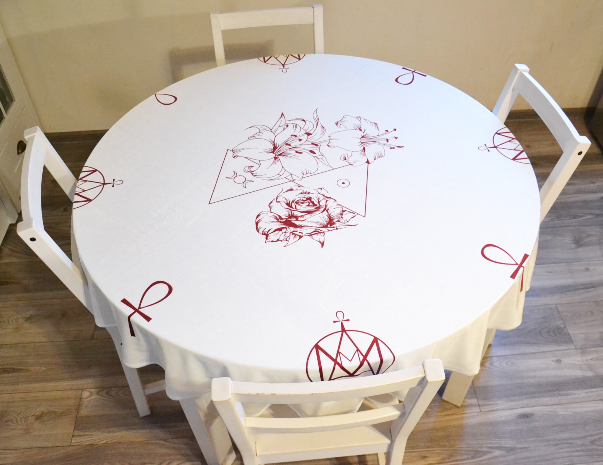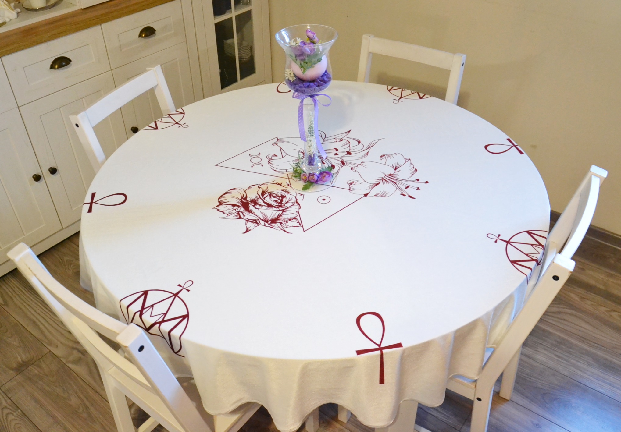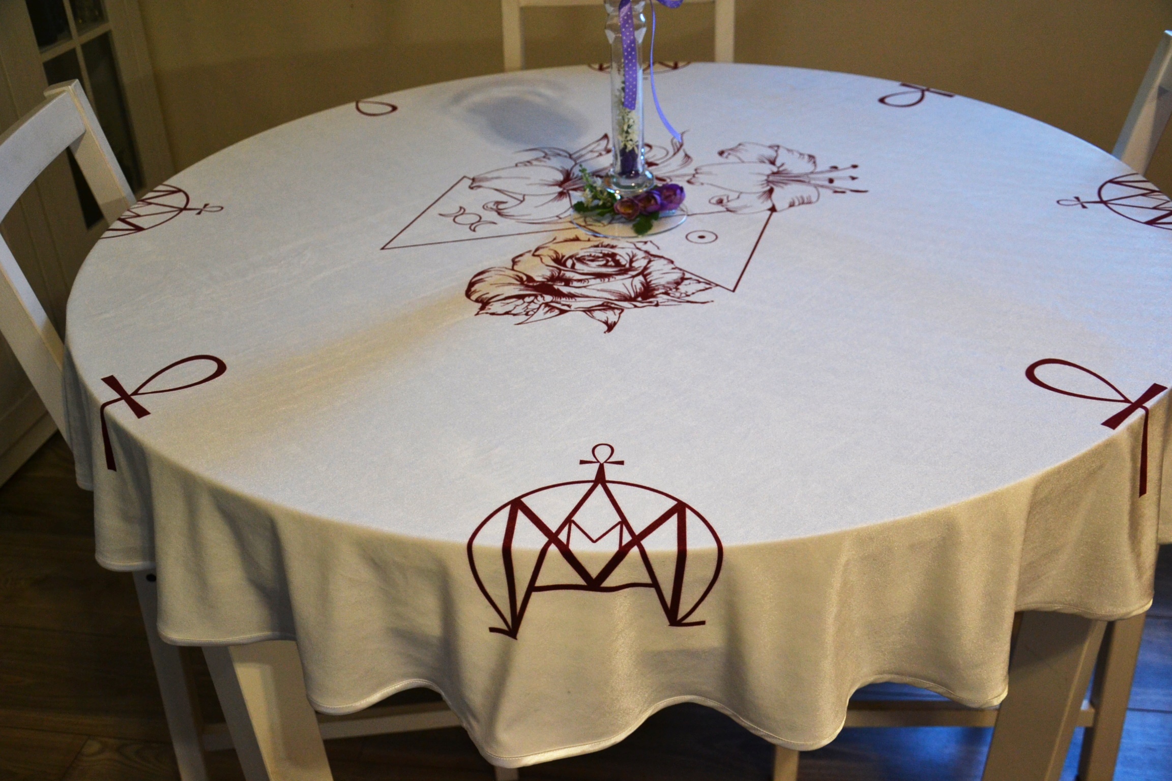 Obrus biały ze wzorem MM  wykonany z weluru w kształcie koła o średnicy 1,5 m, obszyty lamówką.