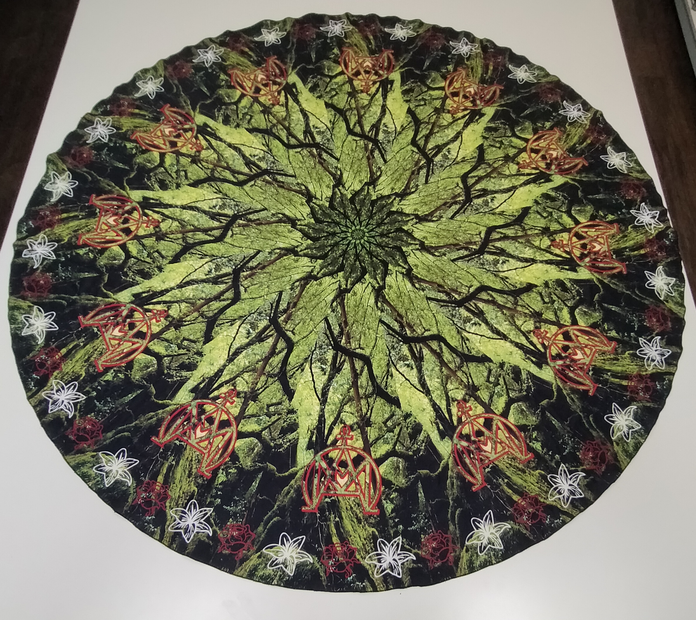Obrus ze wzorem żywiołu Ziemi  II wykonany z weluru w kształcie koła o średnicy 1,5 m, obszyty lamówką.