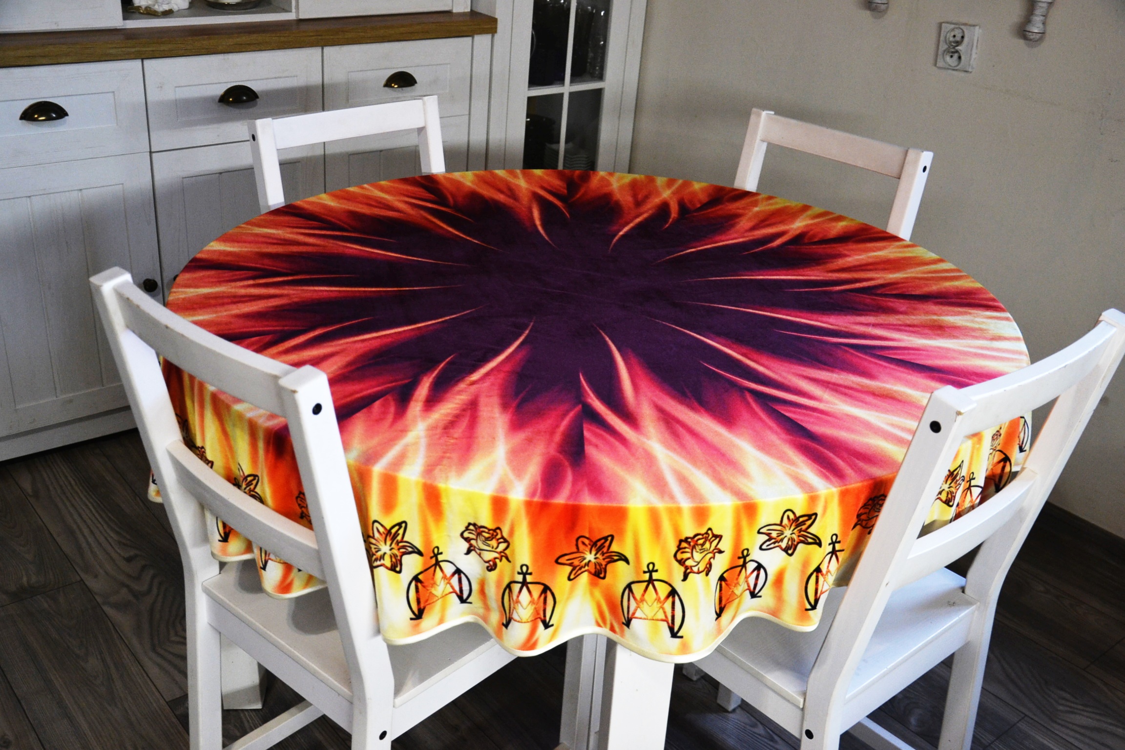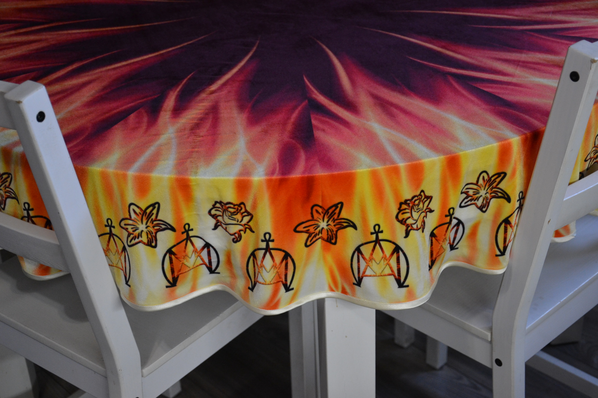 Obrus ze wzorem żywiołu ognia II wykonany z weluru w kształcie koła o średnicy 1,5 m, obszyty lamówką.