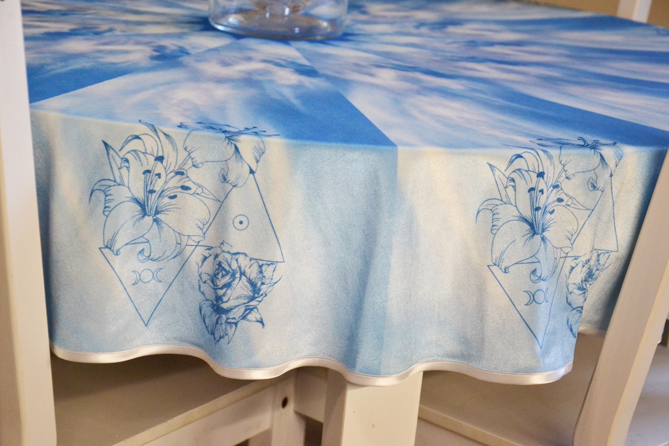Obrus ze wzorem żywiołu powietrza wykonany z weluru w kształcie koła o średnicy 1,5 m, obszyty lamówką.