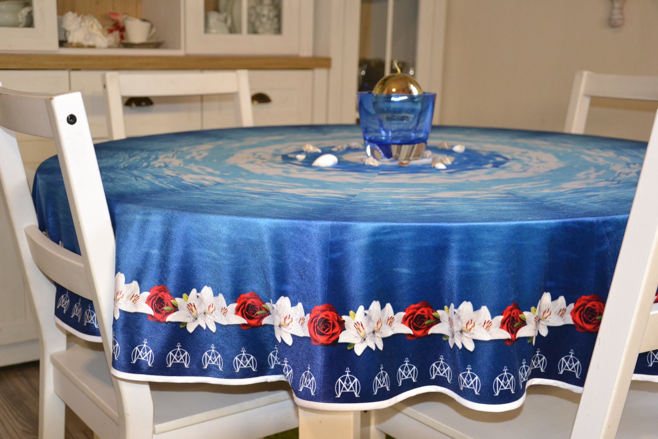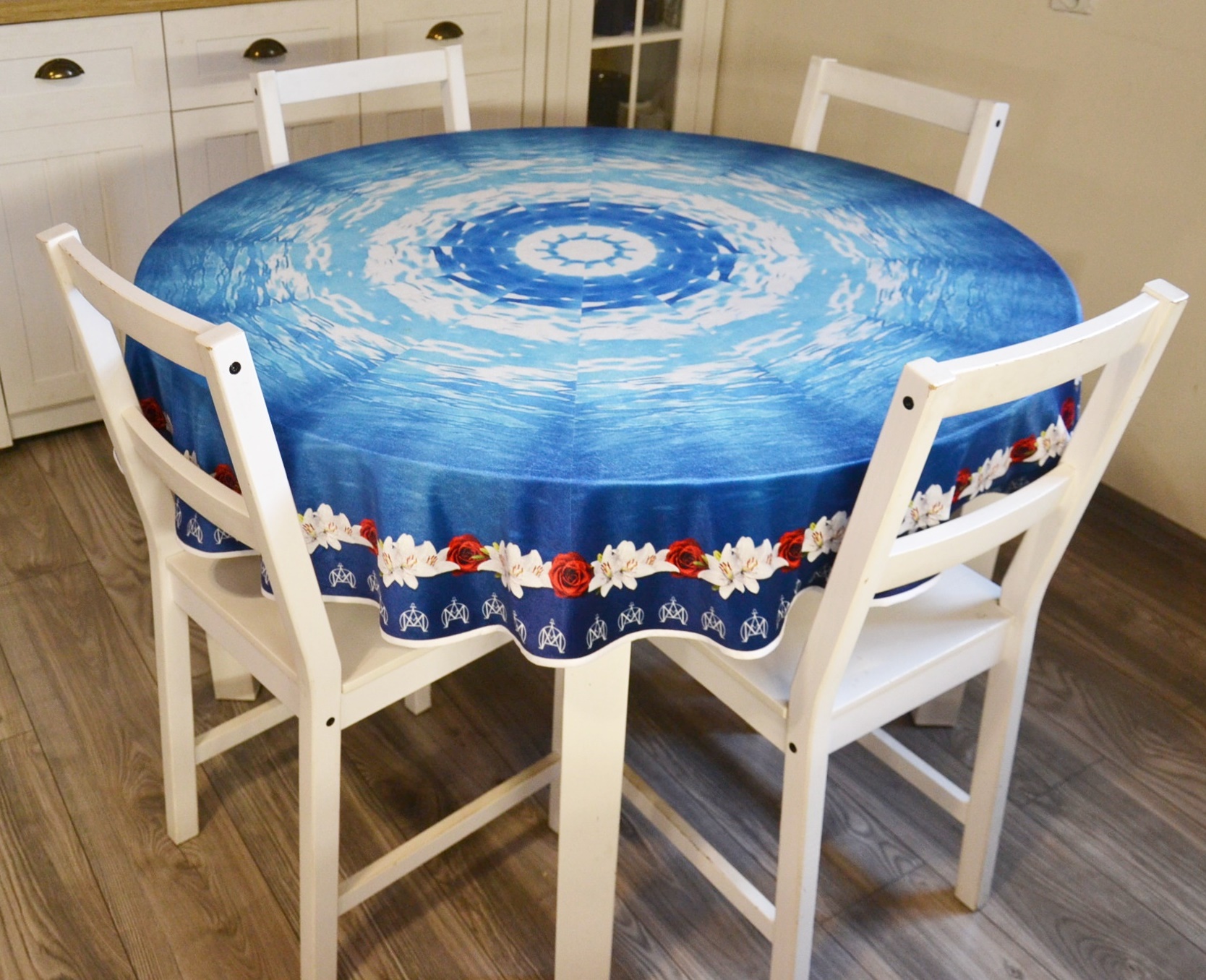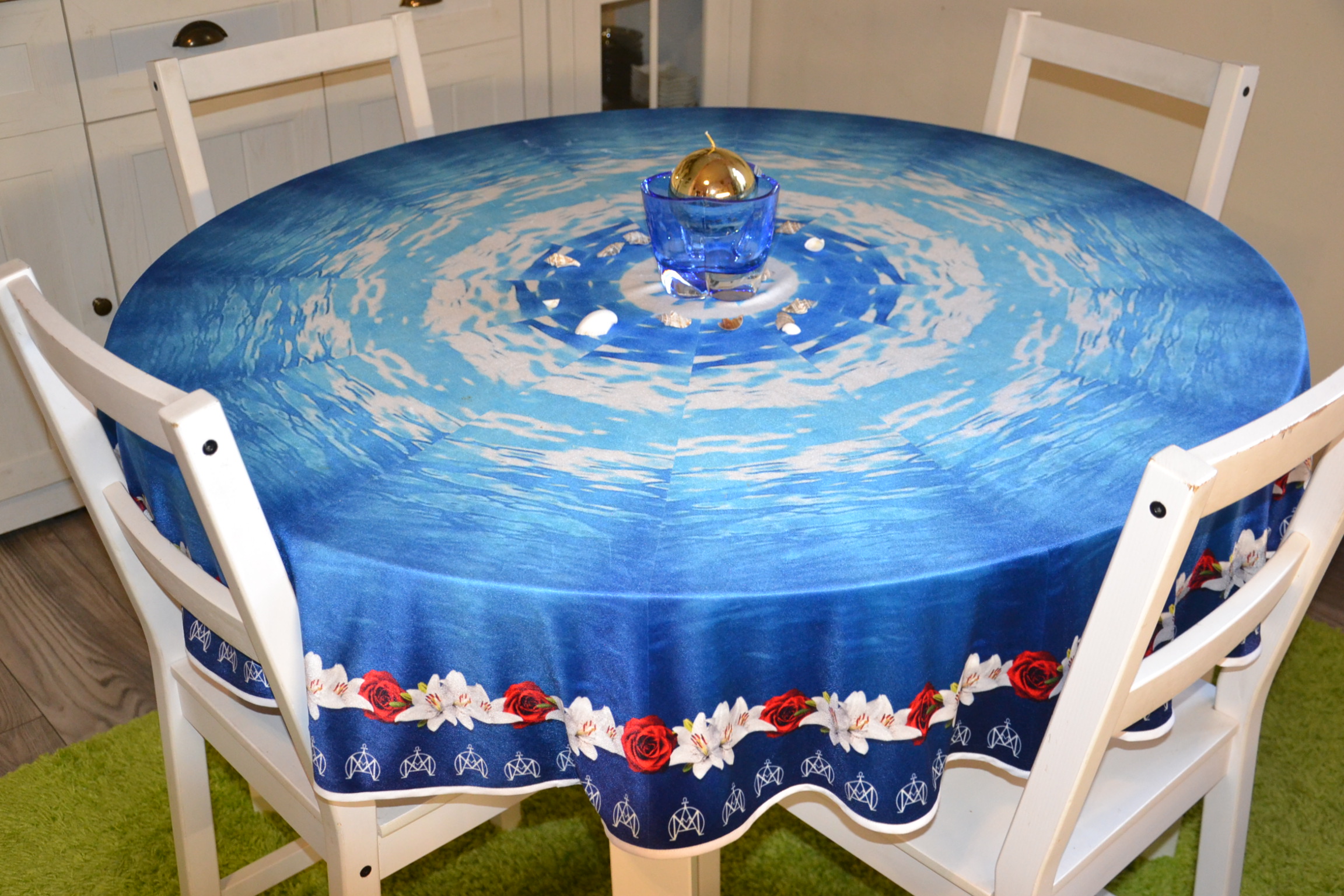 Obrus ze wzorem żywiołu wody wykonany z weluru w kształcie koła o średnicy 1,5 m, obszyty lamówką.