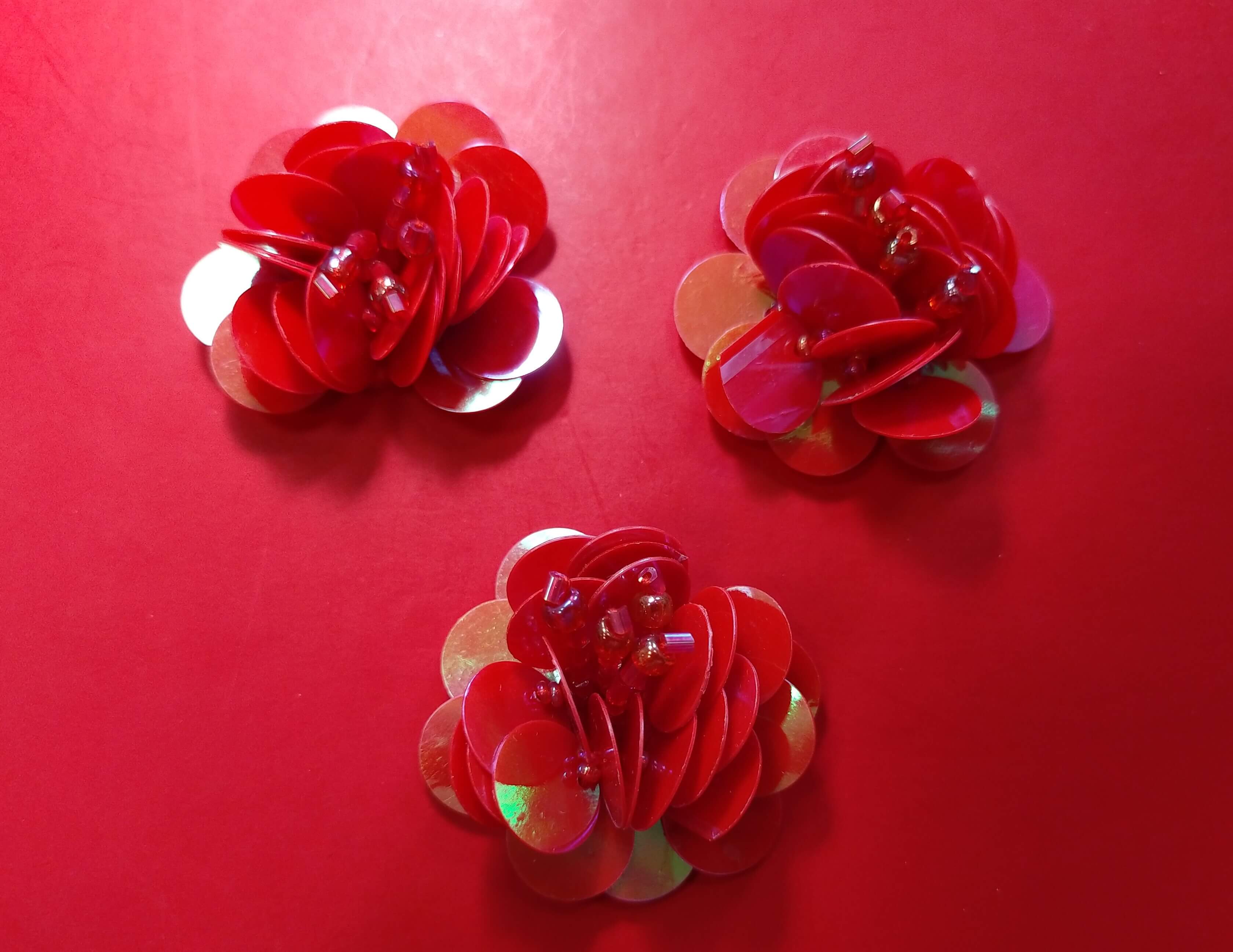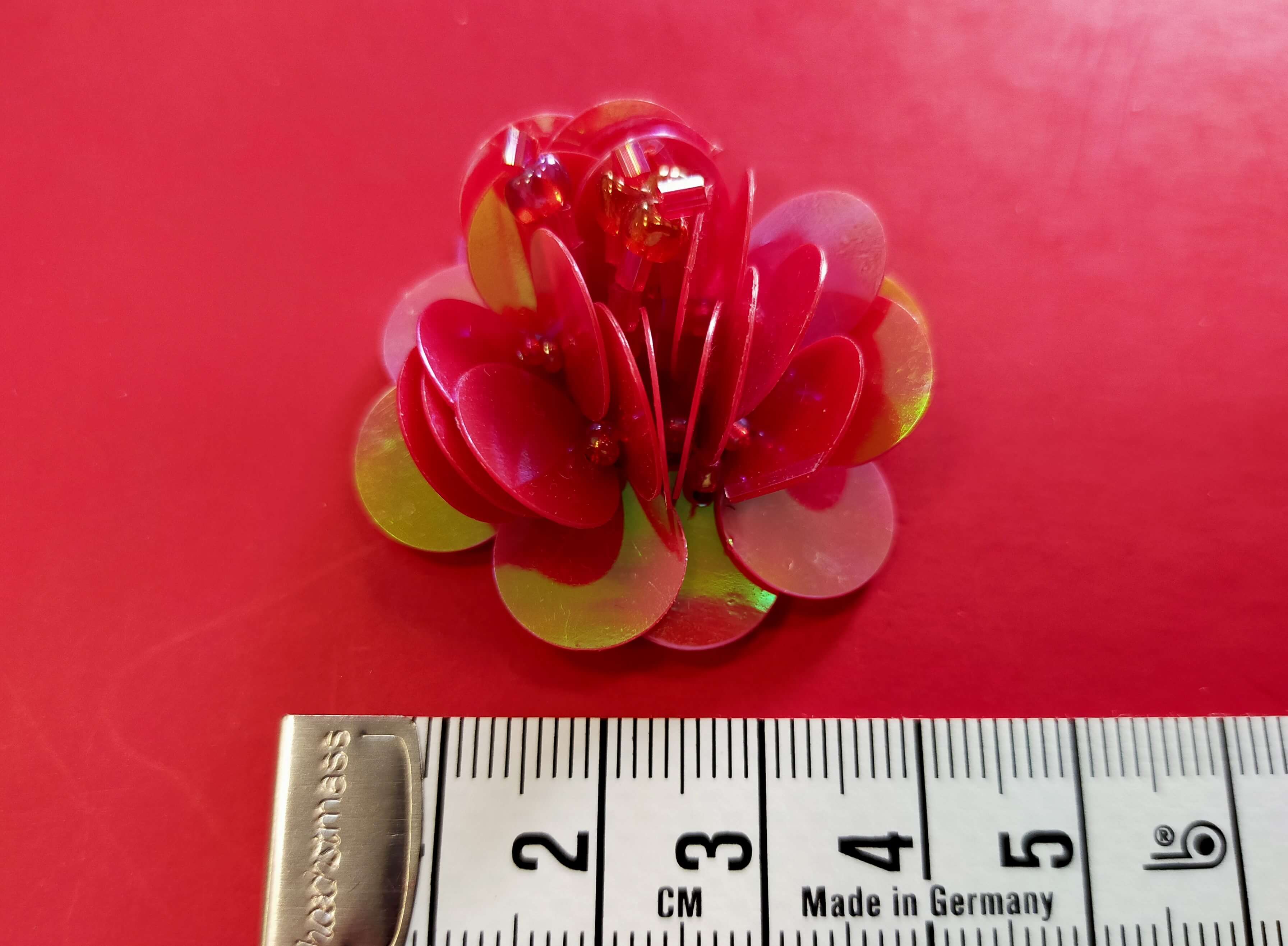 Ozdoba  kwiatek czerwony. Wymiar to 4 cm. Przykładowe zastosowanie: do sweterka, toreb, plecaków, sukienek