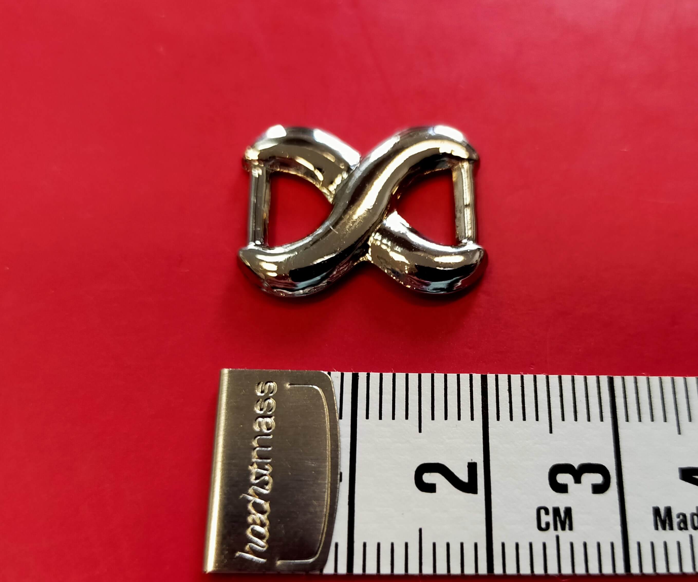 Ozdoba nieskończoność srebrna o wymiarze 2 cm x 1 cm. Przykładowe zastosowanie: jako łączka do naramki, ozdoba przy paseczku do bluzki, fantazyjne wykończenie rękawka.