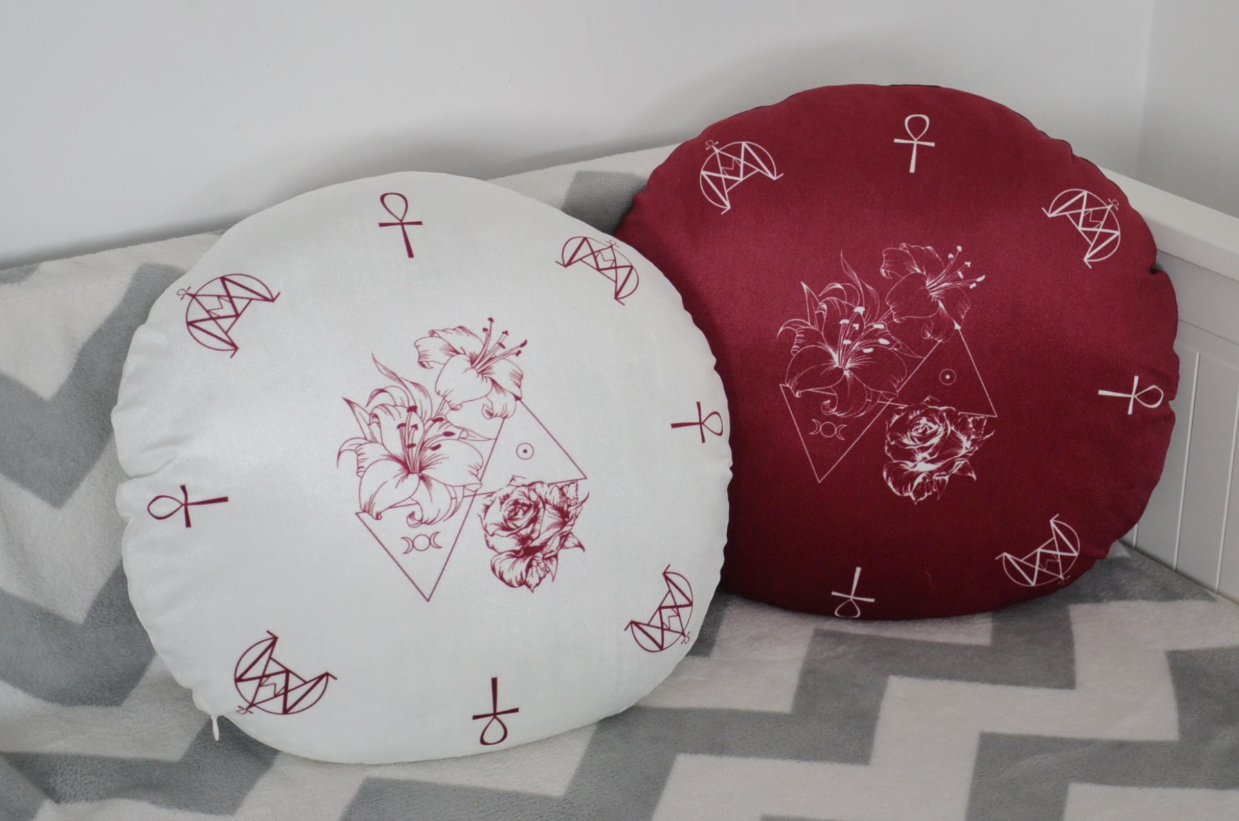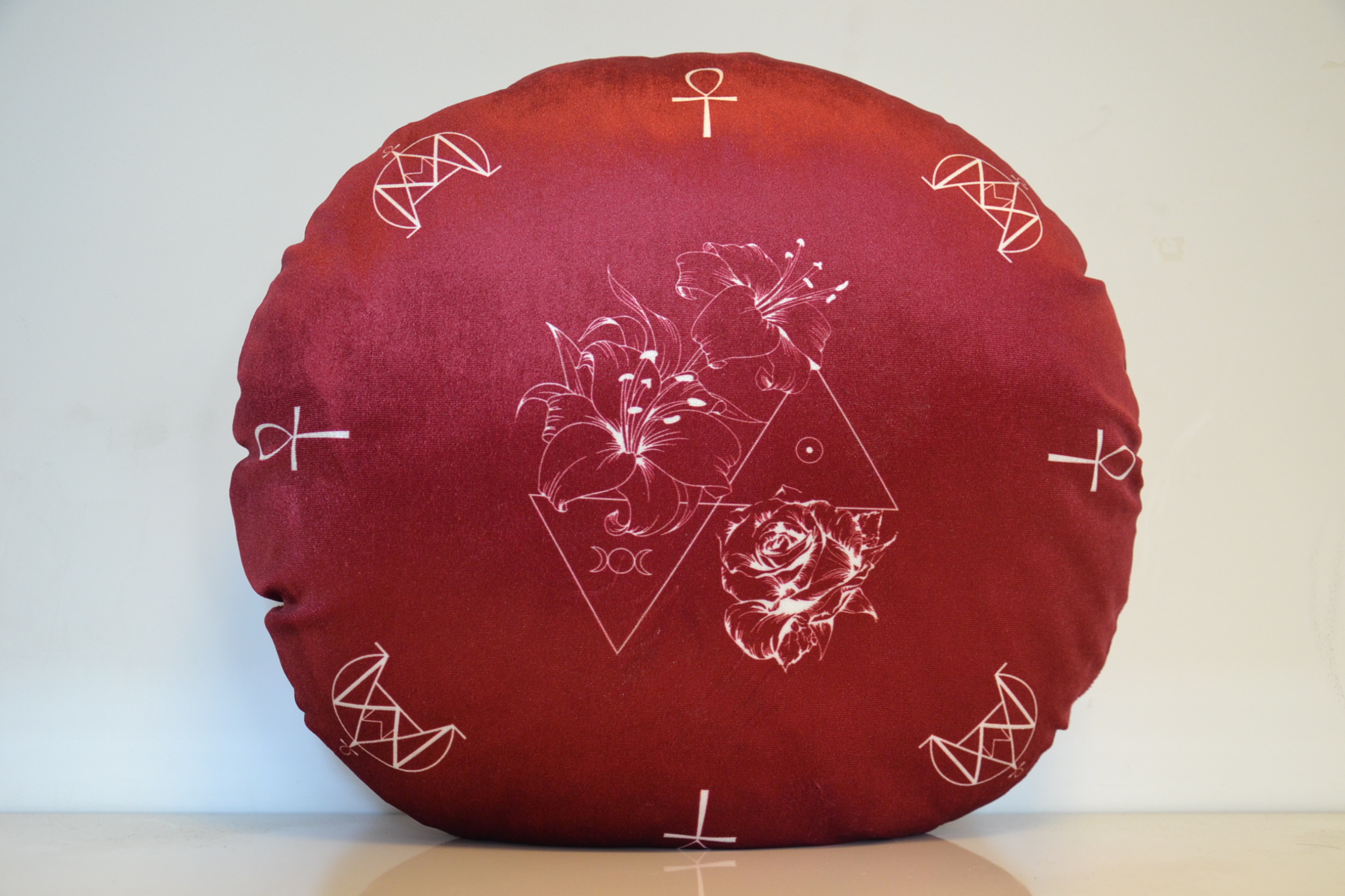 Poduszka bordo ze wzorem MM okrągła o średnicy 45 cm, z wszytą kieszonką np.na zioła.