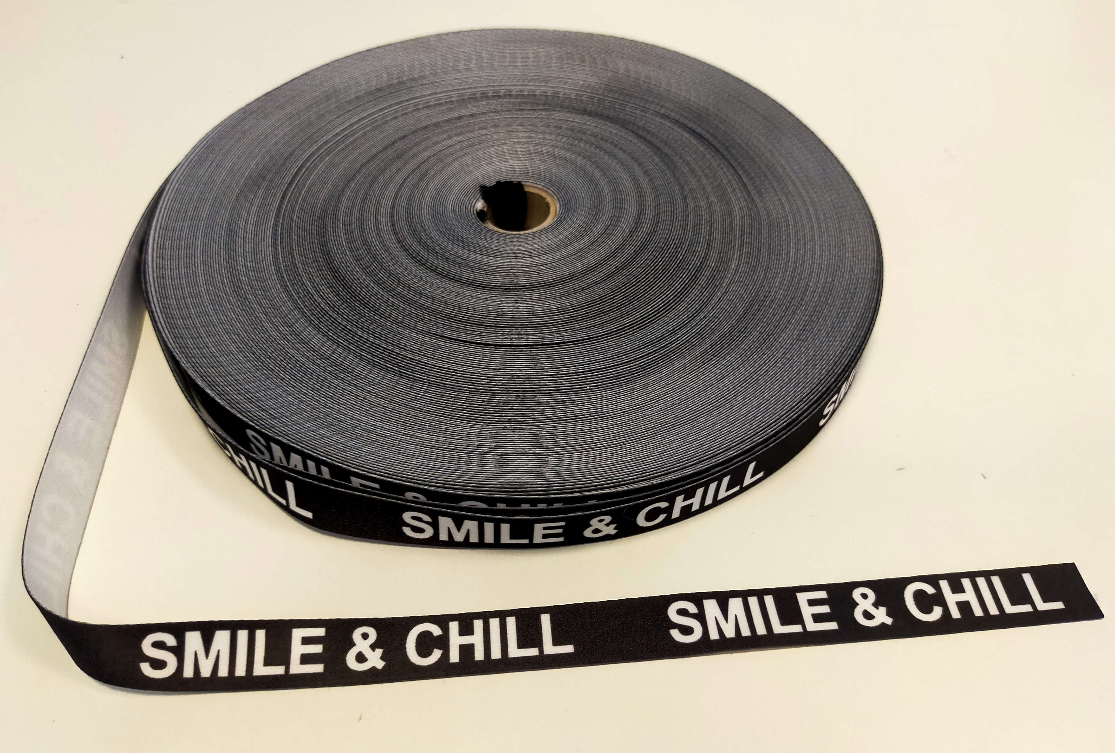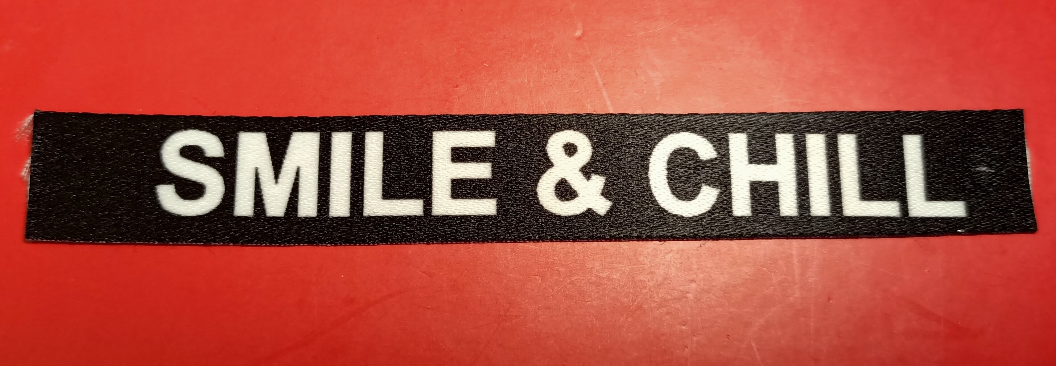 Taśma rypsowa smile & chill. Szerokość 1,5 cm. Przykładowe zastosowanie: do plecaków, toreb, bluzek, bluz, kurtek, smycz do kluczy, lampasów. Cena obejmuję sztukę a sztuka to 50 cm. Większa ilość to wielokrotność 0,50 cm czyli 2szt to 1 m.