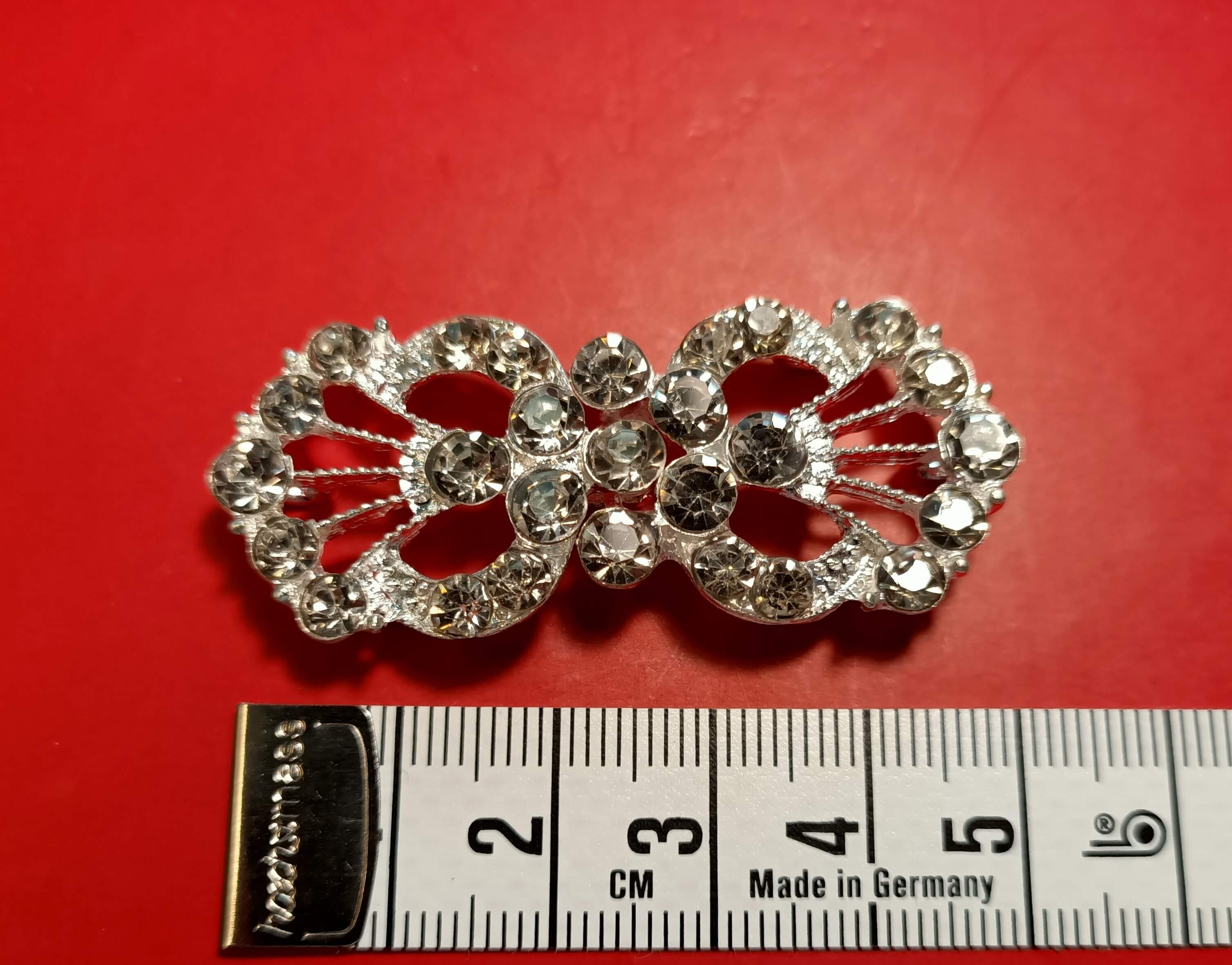 Zapięcie ozdobne o wymiarze  5 cm x 2,5 cm. Przykładowe zastosowanie: zapięcie do torebki, ozdoba do paska, marynarek, kamizelek