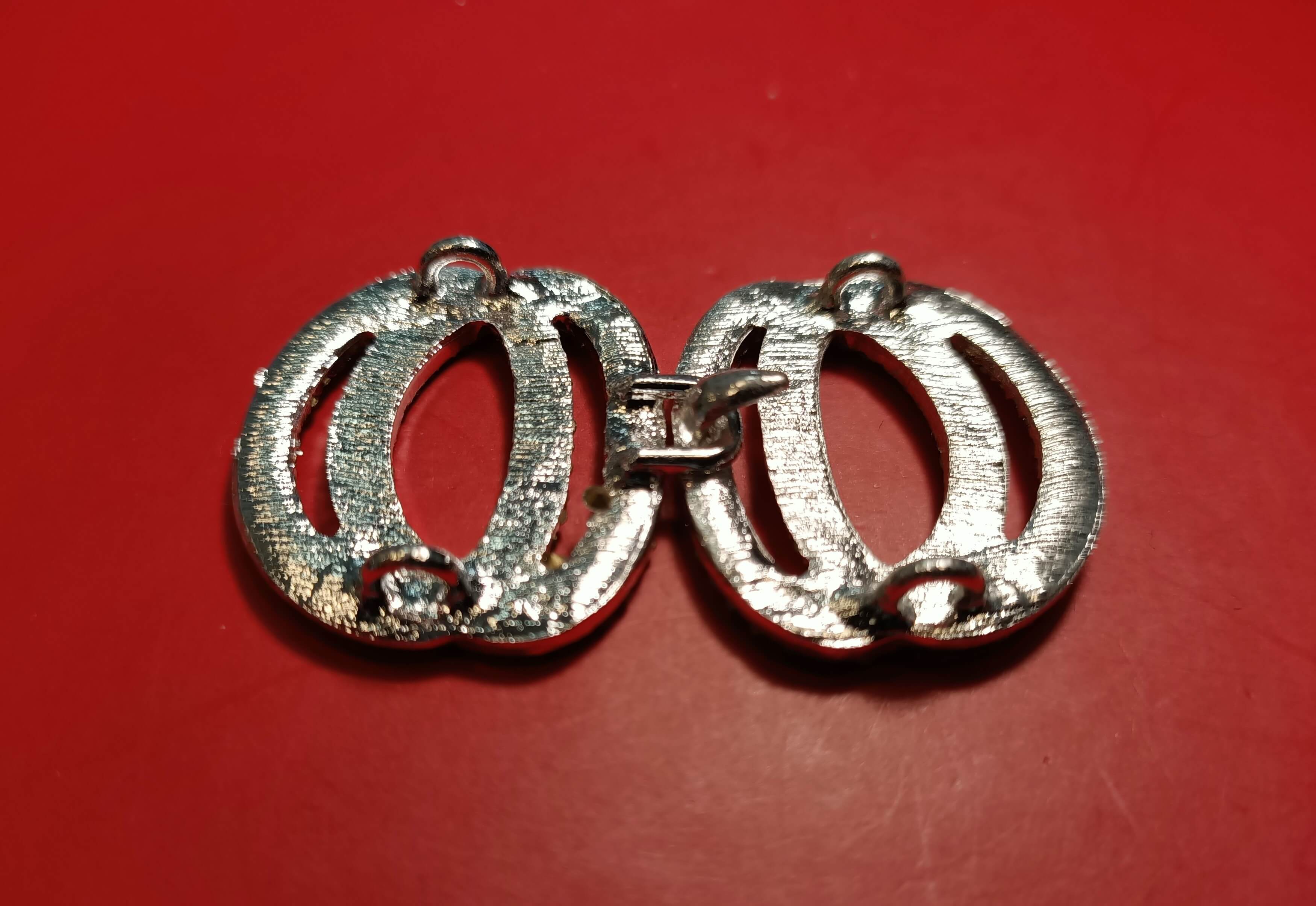 Zapięcie ozdobne srebrne rozpinane o wymiarze 5 cm x 3 cm.  Przykładowe zastosowanie: zapięcie do torebki, ozdoba do paska, marynarki, kamizelki