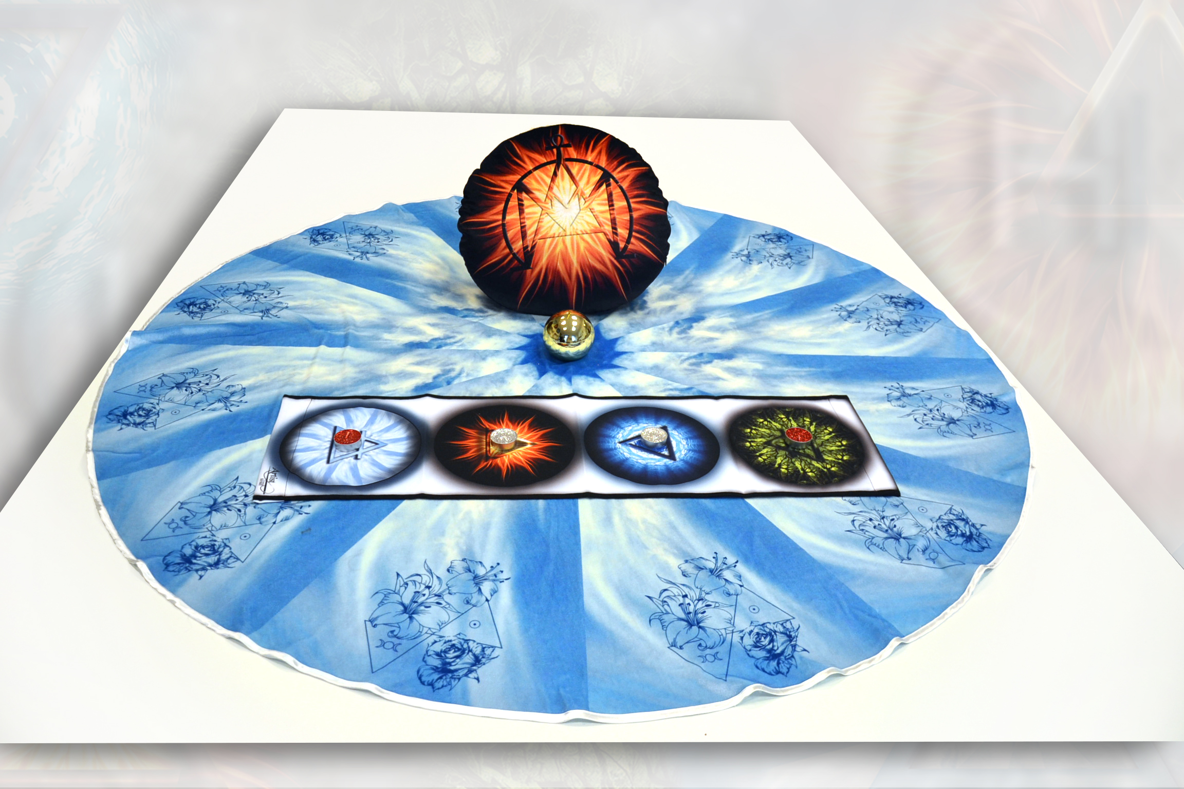 W skład zestawu wchodzi: obrus ze wzorem żywiołu powietrza, średnia makata z czteroma żywiołami oraz poduszka (+wkład) z żywiołem ognia.